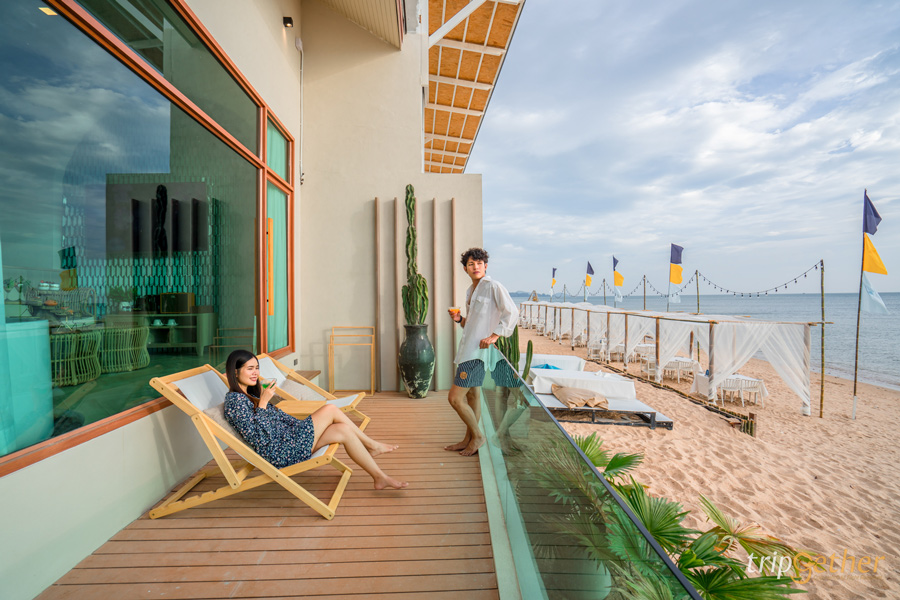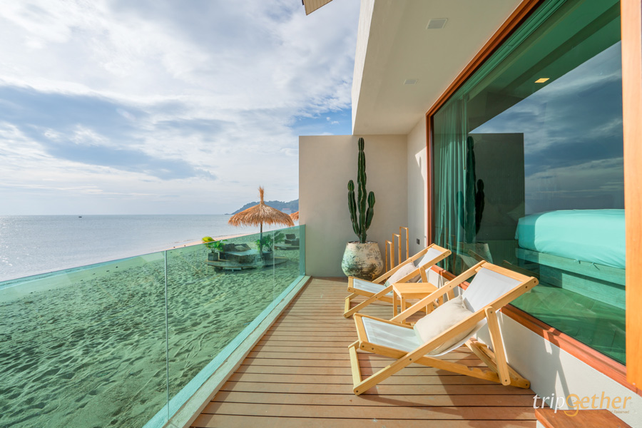 มุมพักผ่อนหย่อนใจที่ริมระเบียง จะนั่งอาบแดดหรือทำกิจกรรมต่างๆ เช่น อ่านหนังสือ ก็ได้นะ มองเห็นวิวทะเลแบบ 180 องศา แถมยังมีประตูเล็กๆ ให้เปิดออกไปเดินเล่นที่ชายหาดได้ทันที