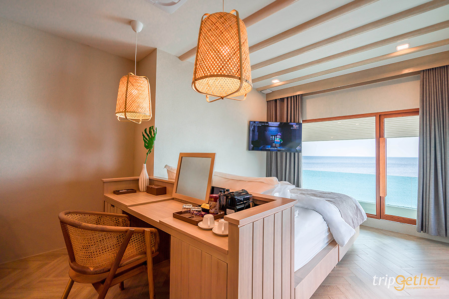 ถัดมาก็คือห้องแบบสุดท้าย มีชื่อว่าห้อง Romance Ocean View Studio ห้องนี้จะแตกต่างจากห้องทั้ง 2 แบบก่อนหน้าตรงที่จะอยู่ชั้นบนกว่า ทำให้ไม่มีประตูตรงระเบียงให้เดินลงชายหาด แต่ความพิเศษต่างๆ ก็ยังอยู่ครบถ้วนเหมือนเดิม เตียงหันหน้าออกสู่ทะเล เบื้องหน้าเป็นหน้าต่างกระจกบานใหญ่มองเห็นวิวทะเลจากบนเตียง