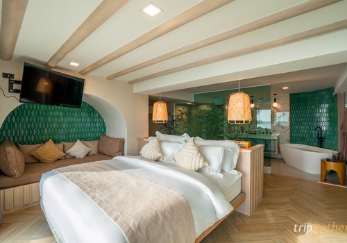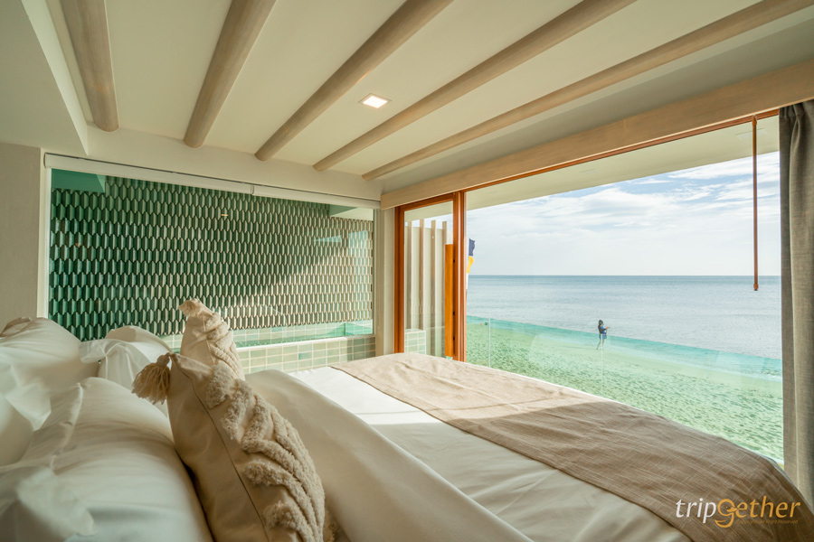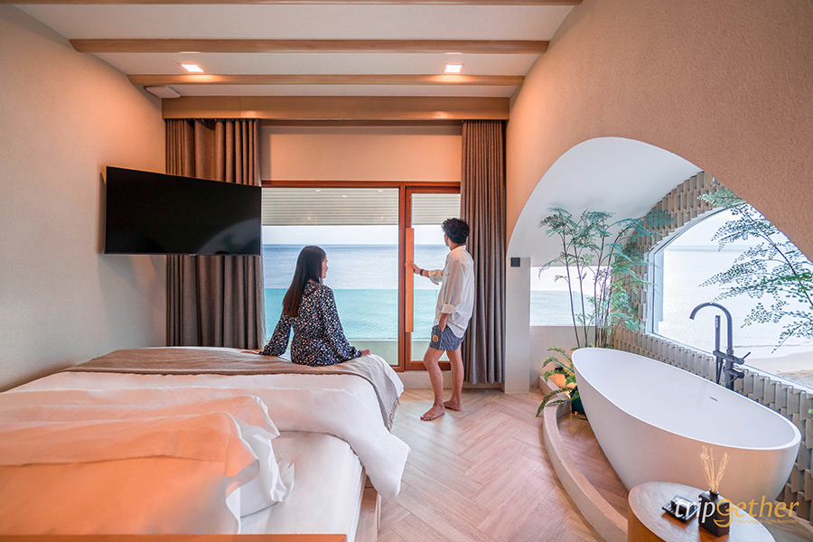 ห้องแรกคือ Beachfront Honeymoon Suite ห้องพักสุดโรแมนติกเหมาะสำหรับมาฮันนีมูนแบบชื่อห้อง ตัวห้องตกแต่งเน้นสีขาวน้ำตาลให้ความรู้สึกอบอุ่น สำหรับห้องนี้พิเศษตรงที่ตัวห้องแบ่งออกเป็น 2 ชั้น ทำให้ภายในห้องดูกว้างขวางและโปร่งโล่งสบาย เมื่อเปิดประตูเข้ามาก็จะเจอกับเตียงหันหน้าออกสู่วิวทะเลเป็นอันดับแรก จากนั้นก็จะเจอกับบันไดให้เดินลงไปยังชั้นล่างของห้อง จะมีโซฟาตัวใหญ่ตั้งหันหน้าออกสู่วิวทะเลเช่นกัน และไฮไลท์สุดพิเศษคือ อ่างอาบน้ำที่ตั้งริมกระจก สามารถแช่ตัวและดูวิวไปพร้อมๆ กันได้ หรือจะหามุมถ่ายรูปเช็คอินเก๋ๆ ก็ได้เช่นกัน