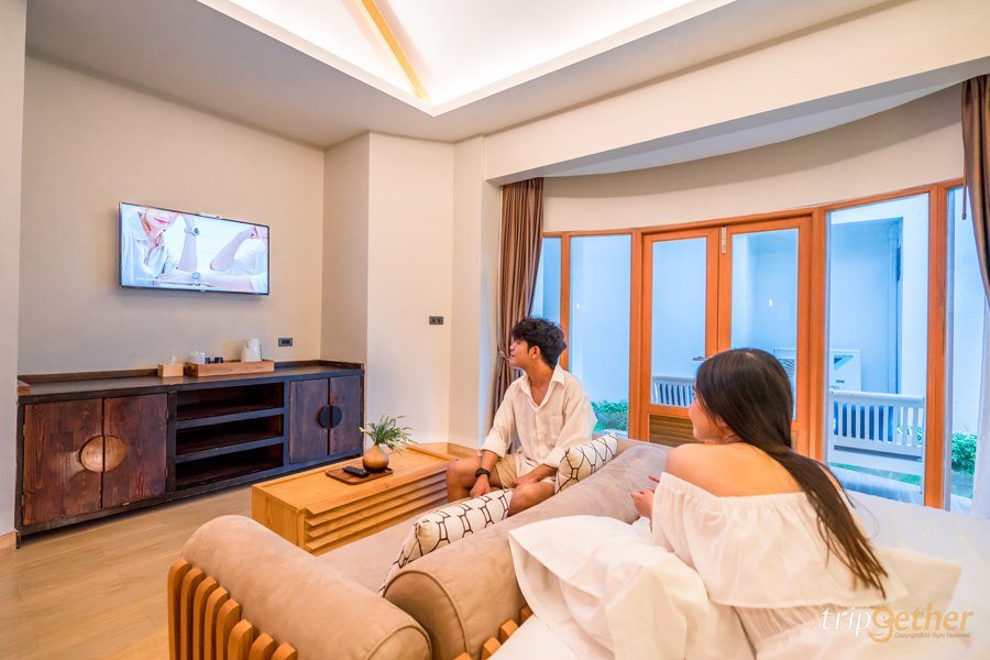 มาดูภายในห้องกันดีกว่า ห้องใช้สีขาวเป็นหลัก ส่วนเฟอร์นิเจอร์เน้นสีน้ำตาล พร้อมโคมไฟสีส้มสร้างบรรยากาศอบอุ่นภายในห้อง บนหัวเตียงมีลายไม้ตกแต่งเพิ่มความเก๋ให้กับห้องพัก ภายในห้องพักก็มีข้าวของเครื่องใช้และอุปกรณ์อำนวยความสะดวกต่างๆ แบบครบถ้วน และมีเก้าอี้ให้นั่งพักผ่อนที่หน้าวิลล่าอีกด้วย