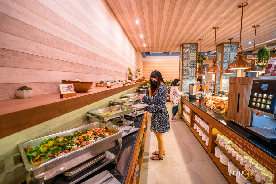 และปิดท้ายด้วยอาหารเช้า สำหรับเมนูอาหารเช้าจะเป็นแบบบุฟเฟ่ต์ตักได้ไม่อั้น มีเมนูอาหารหลากหลายทั้งเมนูพื้นบ้านแบบไทย หรือเมนูอาหารสไตล์ยุโรป เช่น ไข่ดาว ขนมปังปิ้ง แถมยังมีเมนูอาหารญี่ปุ่น อย่างเช่น ทาโกะยากิ อีกด้วย