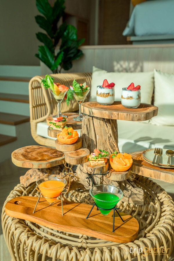 ต่อมาคือเซ็ต Welcome Drink ที่จะเสิร์ฟตอนเช็คอินเข้ามาในห้อง ภายในเซ็ตประกอบไปด้วยของคาว ของหวาน ผลไม้ และเครื่องดื่ม โดยจะจัดวางมาบนขอนไม้ ประดับตกแต่งอย่างสวยงาม หน้าตาน่ากินสุดๆ
