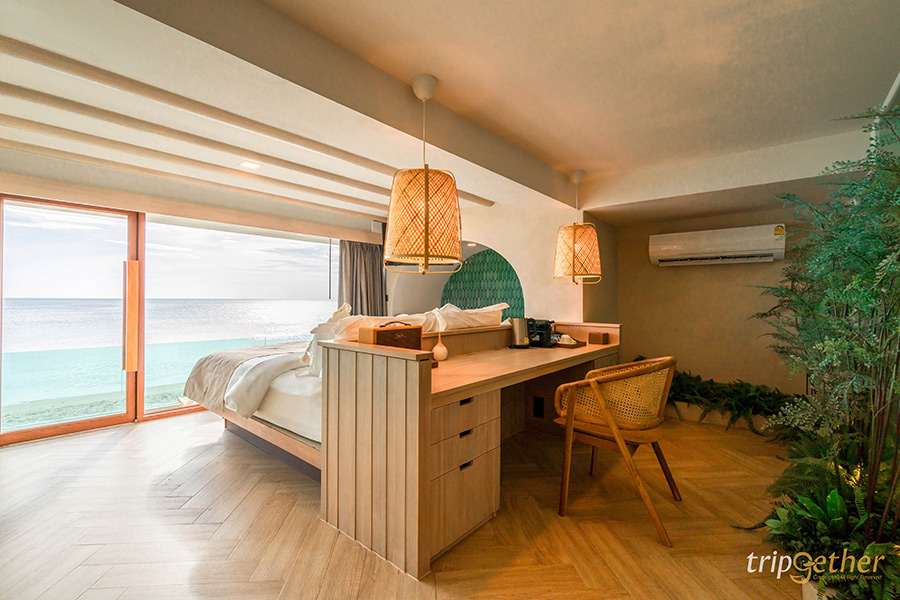 ทางด้านเตียงนอนก็หันออกสู่วิวทะเลเช่นกัน และมีประตูระเบียงให้เปิดออกไปรับลมชมวิว หรือจะเดินลงสู่ชายหาดเลยก็ได้ บอกได้เลยว่าใครเลือกพักโซนห้องใหม่ทั้ง 3 ไทป์นี้ จะได้ความรู้สึกใกล้ชิดทะเลแบบสุดๆ และห้อง Beachfront Paradise Suite ก็จะได้รับเซ็ต Welcome Drink กับเซ็ต Goodnight Drink เช่นเดียวกับห้องแบบแรก
