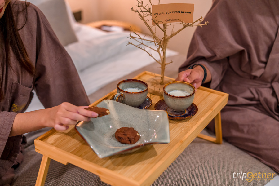 และตบท้ายด้วยเซ็ต Goodnight Drink ที่เสิร์ฟให้ผู้เข้าพักก่อนเข้านอน ภายในเซ็ตประกอบด้วยขนมคุกกี้และนมสดอุ่นๆ ได้กินของอร่อยก่อนนอนเหมือนกับได้รับการบอกกล่าวราตรีสวัสดิ์จากทางรีสอร์ทตามชื่อเซ็ต ทั้งเซ็ต Welcome Drink และ เซ็ต Goodnight Drink มีเสิร์ฟให้สำหรับห้อง Beachfront Honeymoon Suite, Beachfront Paradise Suite และ Romance Ocean View Studio เท่านั้นนะ หากใครไม่อยากพลาดความพิเศษนี้ ต้องเก็บสามห้องนี้ไว้ในลิสต์ทันที