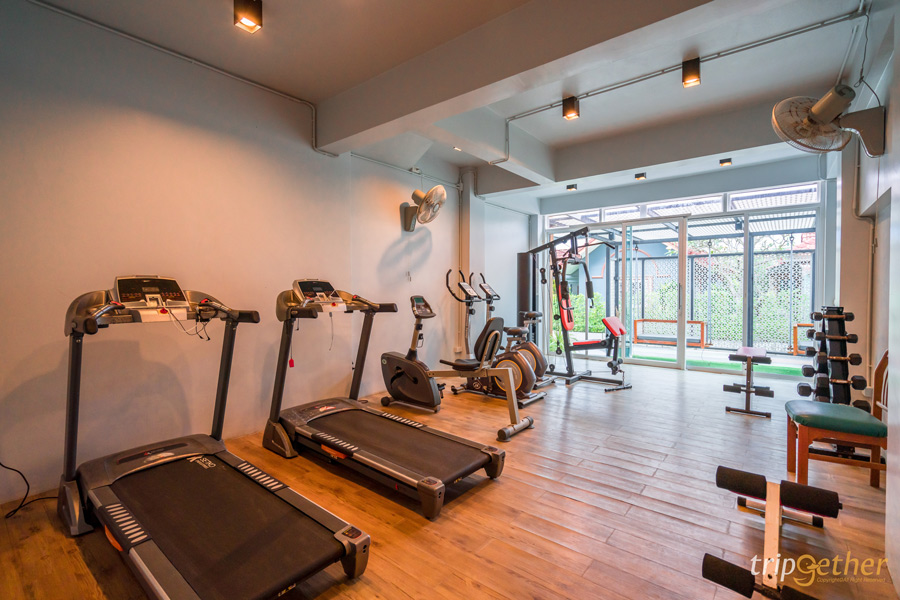 หลังจากดูห้องพักกันจนจุใจแล้ว ขอพาทุกคนวาร์ปมาดูบริการส่วนกลางของที่พักกันบ้างดีกว่า ทางรีสอร์ทมีฟิตเนสพร้อมอุปกรณ์การออกกำลังกายต่างๆ ให้บริการ เอาใจคนรักการออกกำลังกาย