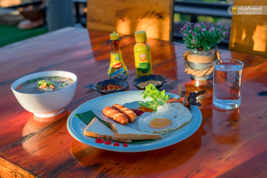 สำหรับเมนูอาหารเช้าก็มีทั้งข้าวต้มหมูร้อนๆ และเซ็ตอเมริกันเบรคฟาสต์
