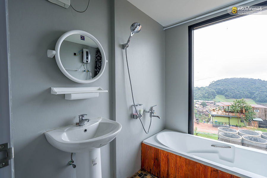 และที่เรียกได้ว่าเป็นอีกหนึ่งไฮไลท์ของ บ้านคอนเทนเนอร์ เลยก็คือ ภายในห้องน้ำจะมี อ่างจากุซซี่ ที่ตั้งอยู่ริมกระจกใสบานใหญ่ ที่แรกและที่เดียวบนม่อนแจ่ม แบบที่เรียกได้ว่าแช่น้ำพร้อมชมวิวภูเขาไปแบบเพลินๆ แถมยังมีฝักบัวแบบ Shower พร้อมทั้งมี แชมพูและครีมอาบน้ำ ให้อาบกันแบบฟินๆ อีกด้วย และที่สำคัญยังมี เครื่องทำน้ำอุ่นระบบไฟฟ้า ให้อาบแบบไม่ต้องกลัวหนาวด้วยนะ