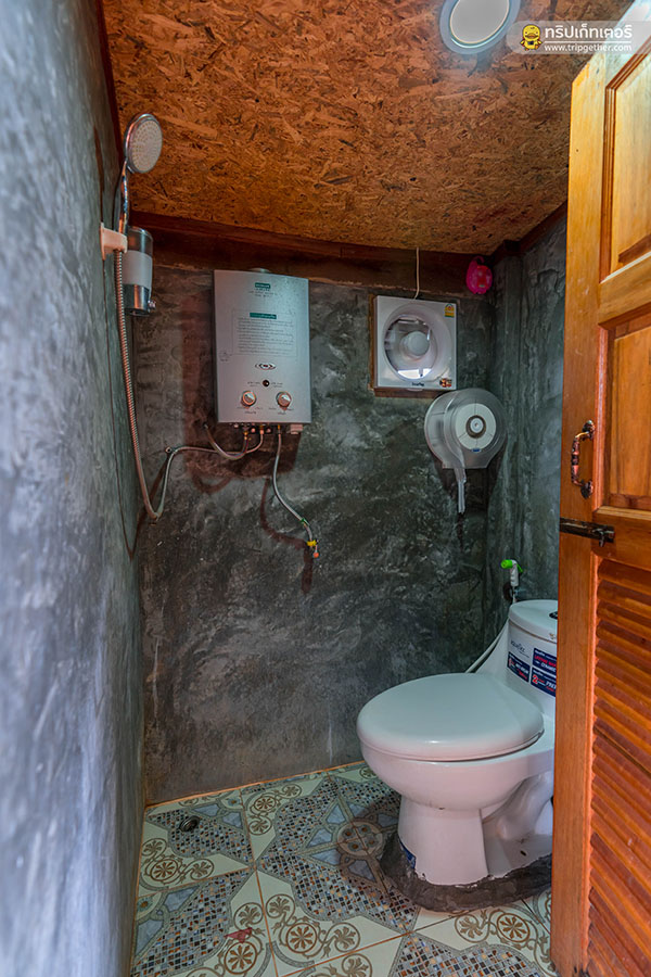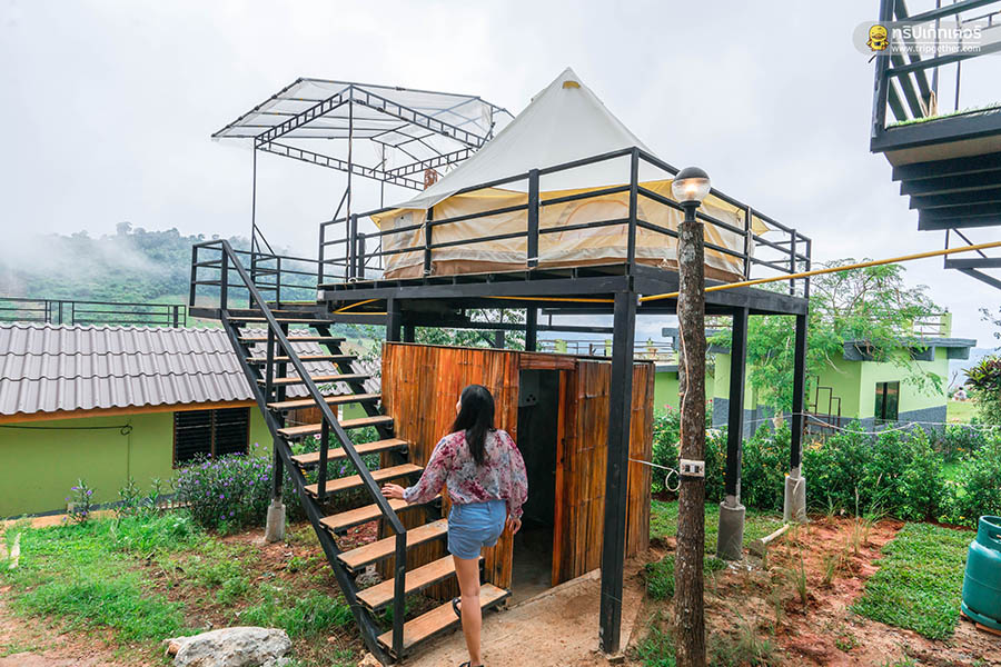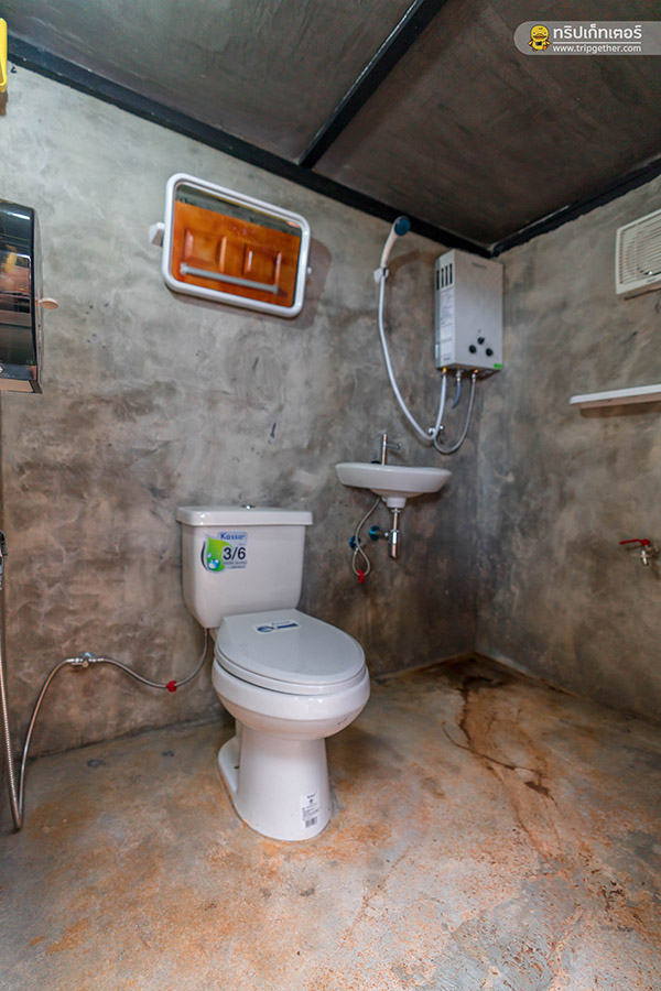 และที่ใต้ถุนตัวเต็นท์กระโจมยังมีห้องน้ำส่วนตัว ที่ภายในห้องน้ำตกแต่งด้วยสไตล์ลอฟท์ปูนเปลือยขัดมันพร้อมทั้งยังมีเครื่องทำน้ำอุ่นระบบแก๊สให้อีกด้วย