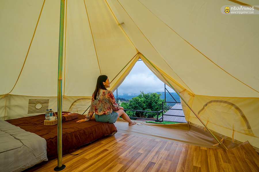ภายใน เต็นท์กระโจม มีพื้นที่กว้างโปร่งและโล่งสบายไม่อึดอัด พร้อมที่นอนสำหรับนอน 2 คน ตัวพื้นเต็นท์กระโจมปูด้วยเสื่อน้ำมันลายไม้ช่วยให้ดูผ่อนคลาย นอกจากนี้ยังมีเซ็ตผ้าเช็ดตัว พัดลม สบู่และน้ำเปล่าให้อีกด้วย ที่สำคัญเต็นท์ของที่นี่เป็นเต็นท์ใหม่และยังสะอาดสุดๆ