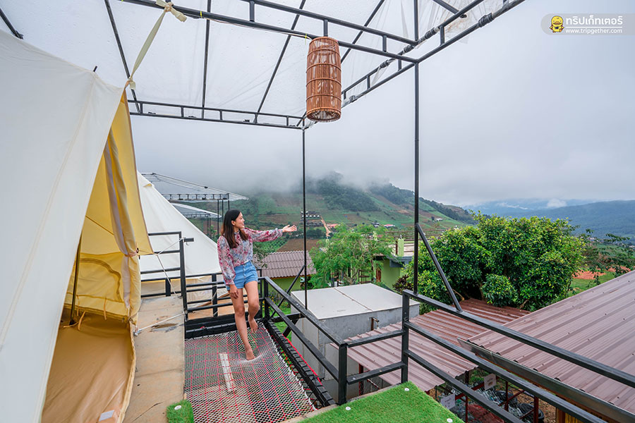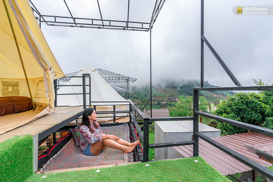เท่านั้นยังไม่พอด้านนอกตัวเต็นท์ของที่นี่ยังมีพื้นที่ให้นั่งเล่นกันแบบชิลล์ๆ กันที่ระเบียงด้านหน้าที่ปูพื้นด้วยหญ้าเทียม พร้อมทั้งยังมีหลังคาใสแบบที่ไม่ต้องกลัวฝนกันเลยทีเดียว และพลาดไม่ได้กับ เปลตาข่าย ด้านหน้าเต็นท์ ที่เป็นอีกหนึ่งไฮไลท์ของ ม่อนตะวัน