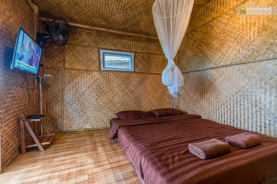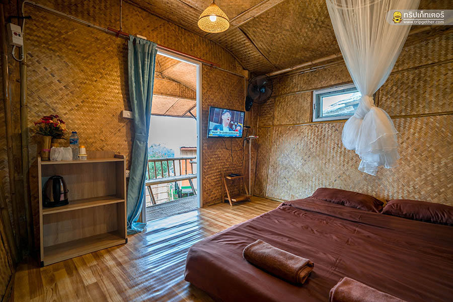 ภายในยังเน้นการตกแต่งด้วยวัสดุจากธรรมชาติอย่างไม้ไผ่สาน พร้อมที่นอนและมุ้งกระโจมสุดน่ารัก ถึงแม้ว่าจะเป็นบ้านไม้ไผ่แต่ภายในก็ครบครันไปด้วยสิ่งอำนวยความสะดวกไม่ว่าจะเป็น พัดลม แอลซีดีทีวี และกาน้ำร้อน