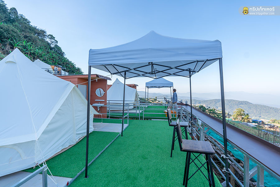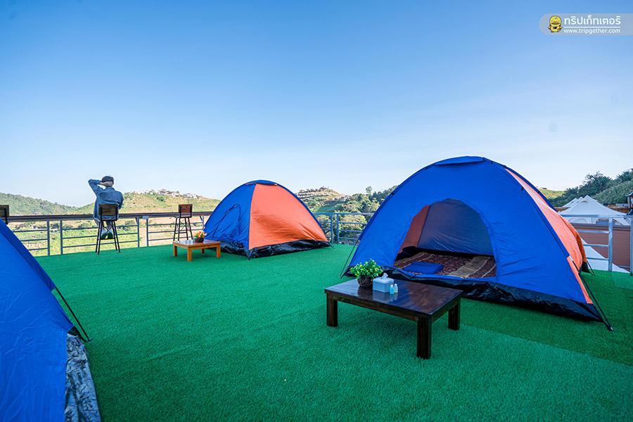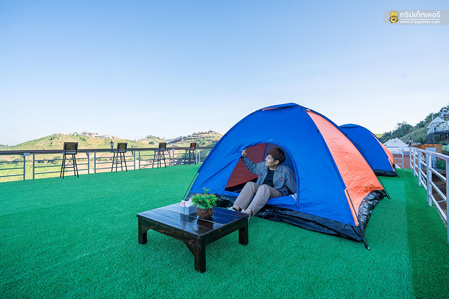 ที่ด้านหน้าเต็นท์ยังมีพื้นที่ระเบียงส่วนตัวที่ปูพื้นด้วยหญ้าเทียมไว้ให้ทำกิจกรรมหรือจะออกมานั่งรับลมชมวิวที่มุมนี้ก็รับรองว่าฟินสุดๆ และยังมีเต็นท์พับสำหรับบังแดดและน้ำค้างไว้ให้อีกด้วย เรียกได้ว่านั่งปาร์ตี้กันได้ทั้งคืนเลยทีเดียว