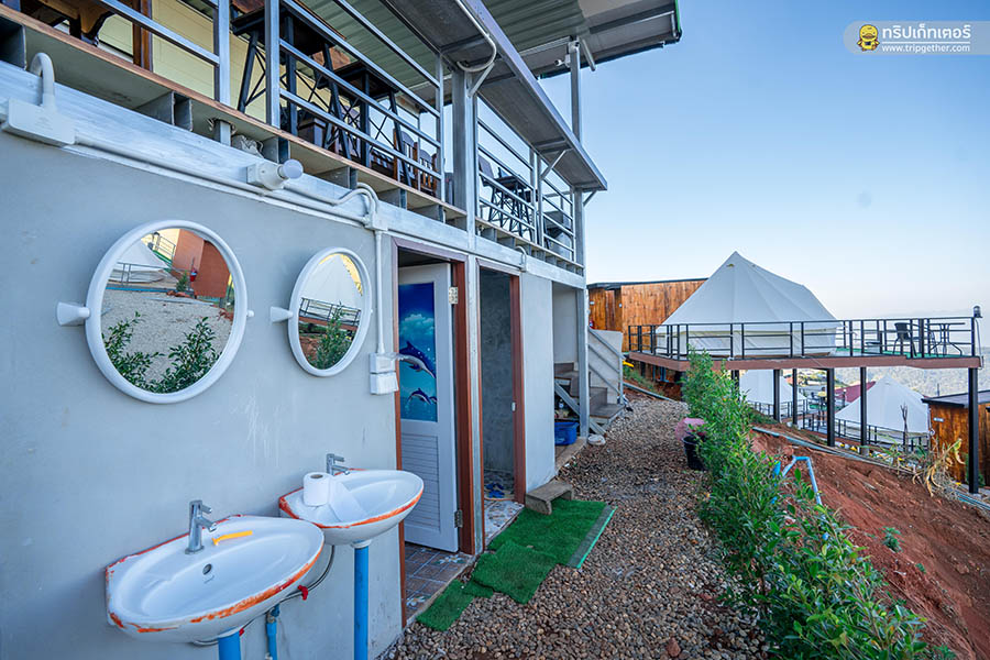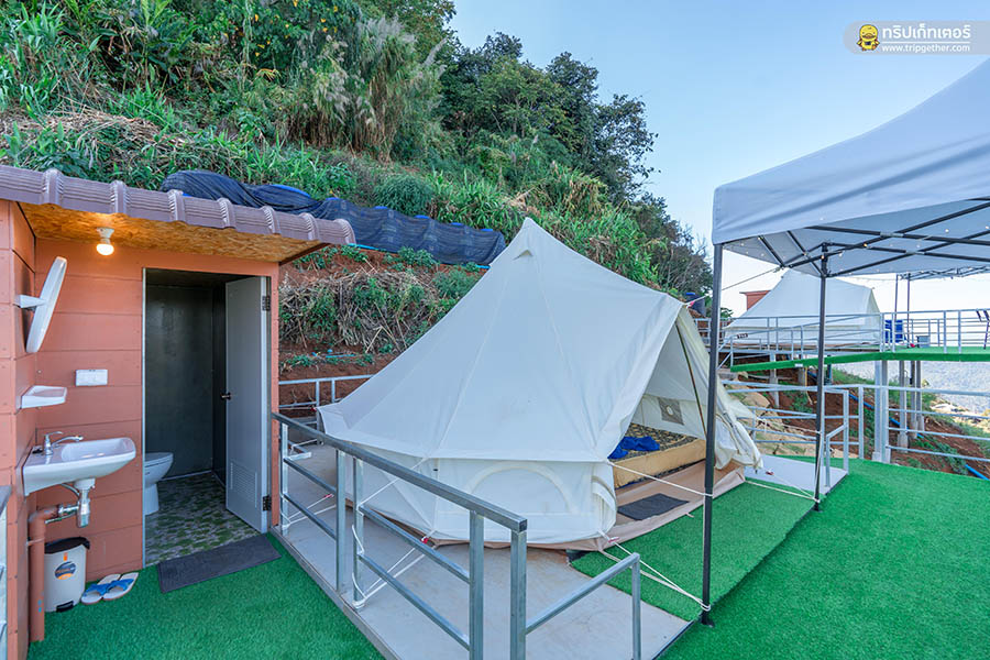 ที่ด้านข้าง เต็นท์กระโจมขาว ทุกหลังยังมีห้องน้ำส่วนตัว ซึ่งภายในห้องน้ำมีเครื่องทำน้ำอุ่นระบบแก๊ส ชุดสุขภัณฑ์ ครีมอาบน้ำและแชมพู