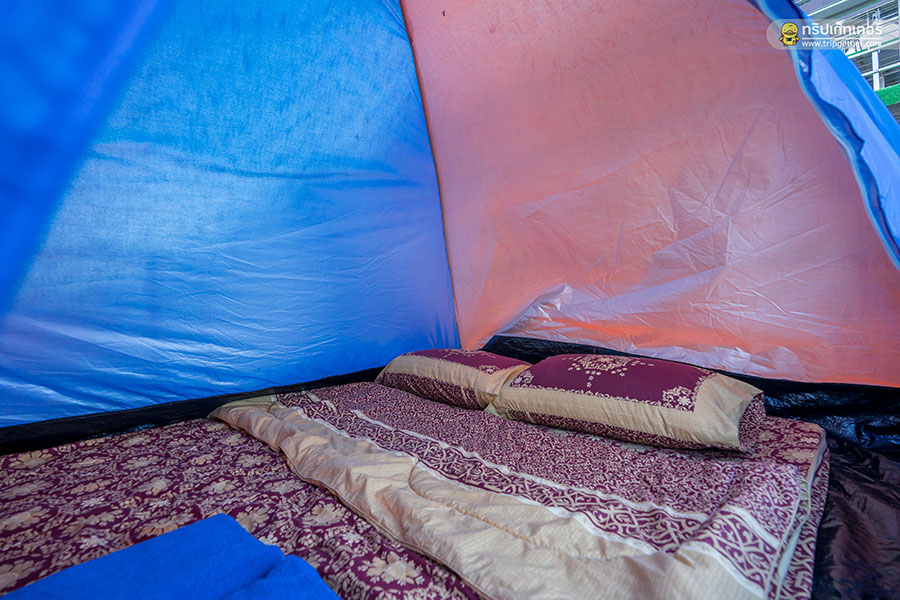 ภายใน เต็นท์ธรรมดา มีที่นอนนุ่มๆ หมอนและผ้าห่มไว้ให้พร้อม เรียกได้ว่ามาถึงที่พักก็เข้าพักผ่อนได้แบบสบายๆ กันเลย ด้านนอกตัวเต็นท์ยังมีเซ็ตโต๊ะญี่ปุ่นไว้ให้นั่งปิ้งหมูกระทะกันอีกด้วย