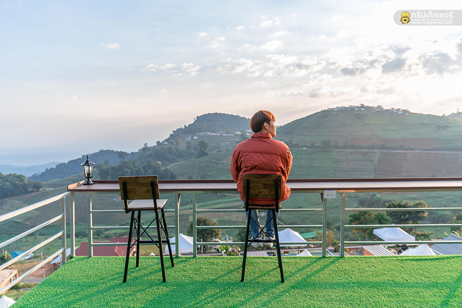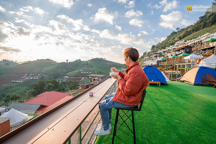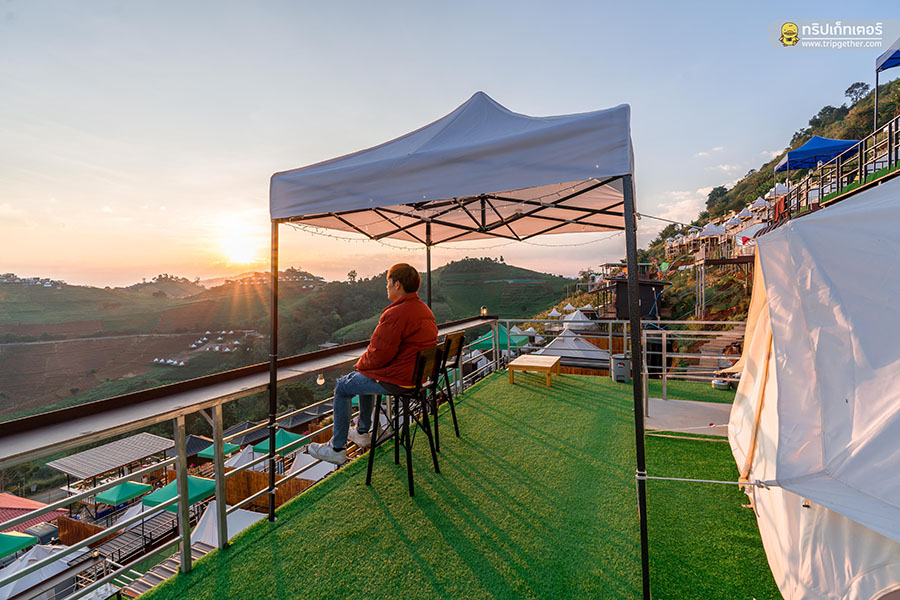 ตื่นเช้ามารับอากาศหนาวๆ หน้าเต็นท์และยังได้ชมพระอาทิตย์ขึ้นซึ่งมุมที่พระอาทิตย์ขึ้นจะอยู่ที่มุมขวามือหากมองจากหน้าระเบียงเต็นท์