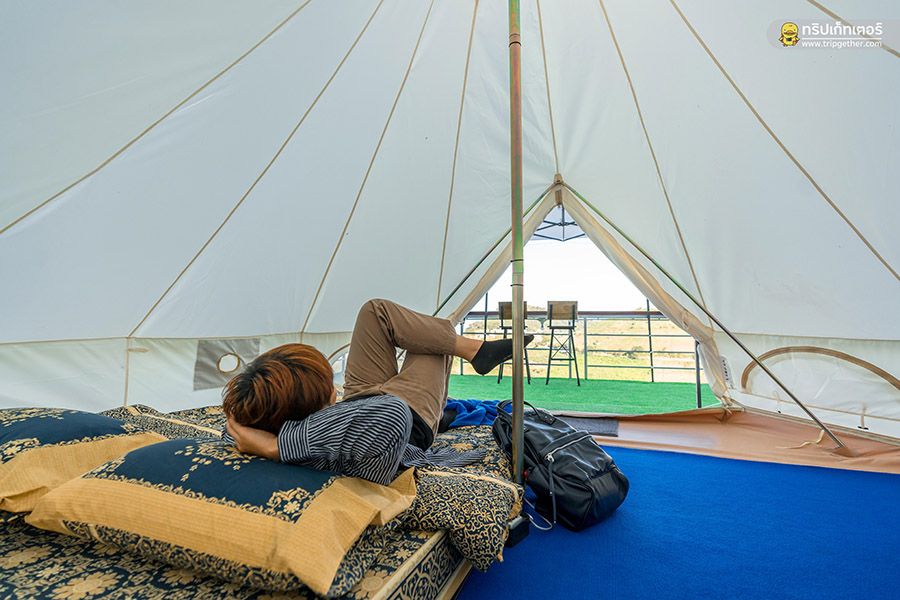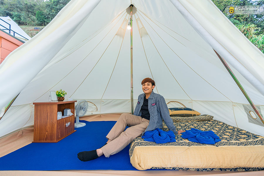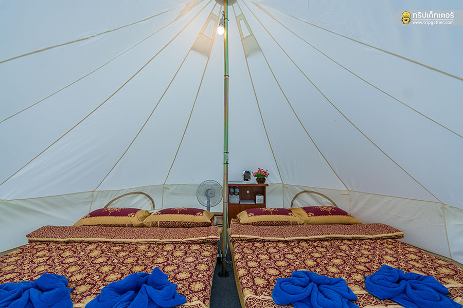 อีกทั้ง เต็นท์กระโจมขาว ยังมีให้เลือกทั้งแบบเข้าพัก 2 คน และเข้าพัก 4 คน ภายในเต็นท์ยังครบครันไปด้วยสิ่งอำนวยความสะดวกทั้ง ที่นอน ชุดเครื่องนอน พัดลม แก้วน้ำ น้ำดื่ม ผ้าเช็ดตัว กระดาษชำระ และปลั๊กไฟ ไว้ให้อีกด้วย