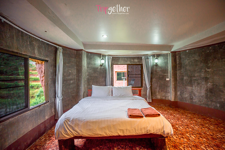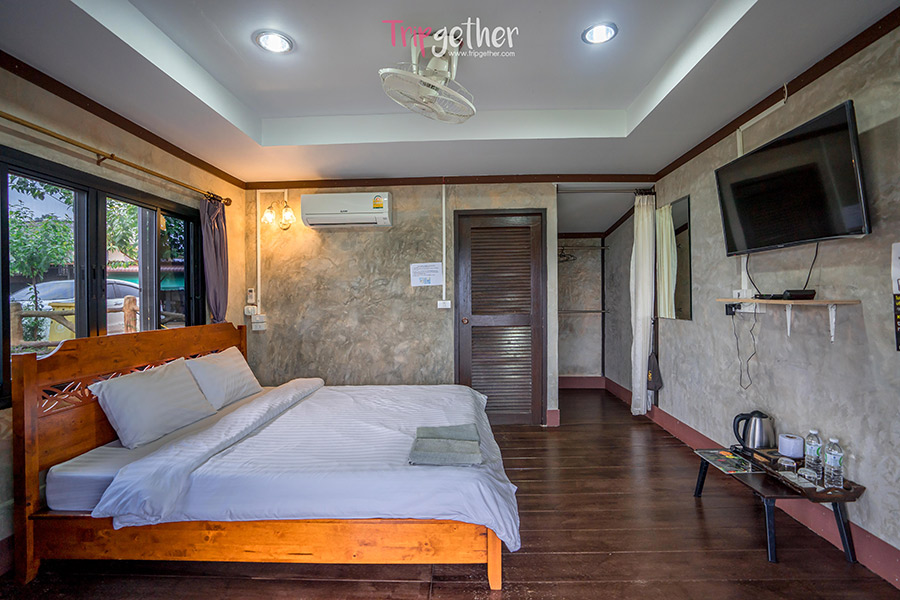 โดยห้องพักของที่นี่แบ่งออกเป็น 4 แบบด้วยกันคือบ้านตึก บ้านขอนไม้ บ้านเป็นหลัง และบ้านแฝด ซึ่งในรีวิวนี้ทริปเก็ทเตอร์ได้รวบรวมบรรยากาศสวยๆ ทั่วทุกมุมของรีสอร์ทมาฝากกัน เริ่มที่ห้องแรก บ้านตึก ห้องพักใกล้โซนห้องอาหารขอรีสอร์ท แต่ให้ความเป็นส่วนตัวสำหรับผู้เข้าพักอย่างแน่นอน