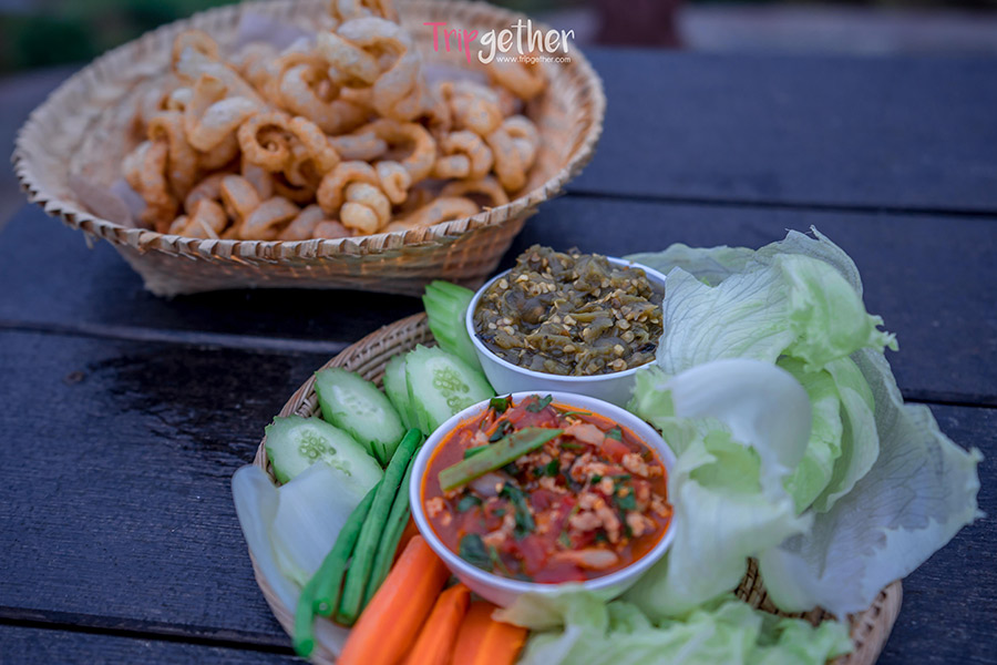 ชุดน้ำพริกอ่องเสิร์ฟพร้อมผักสดและแคปหมู