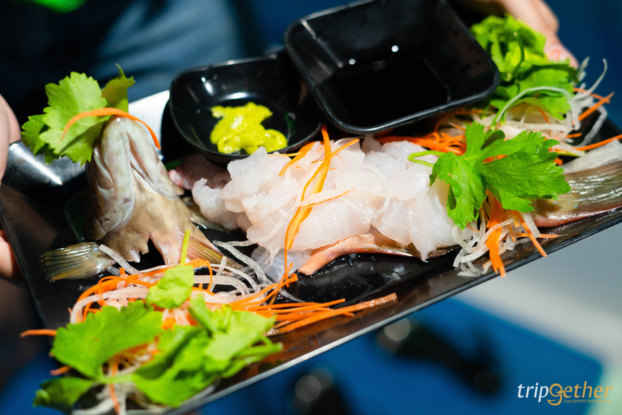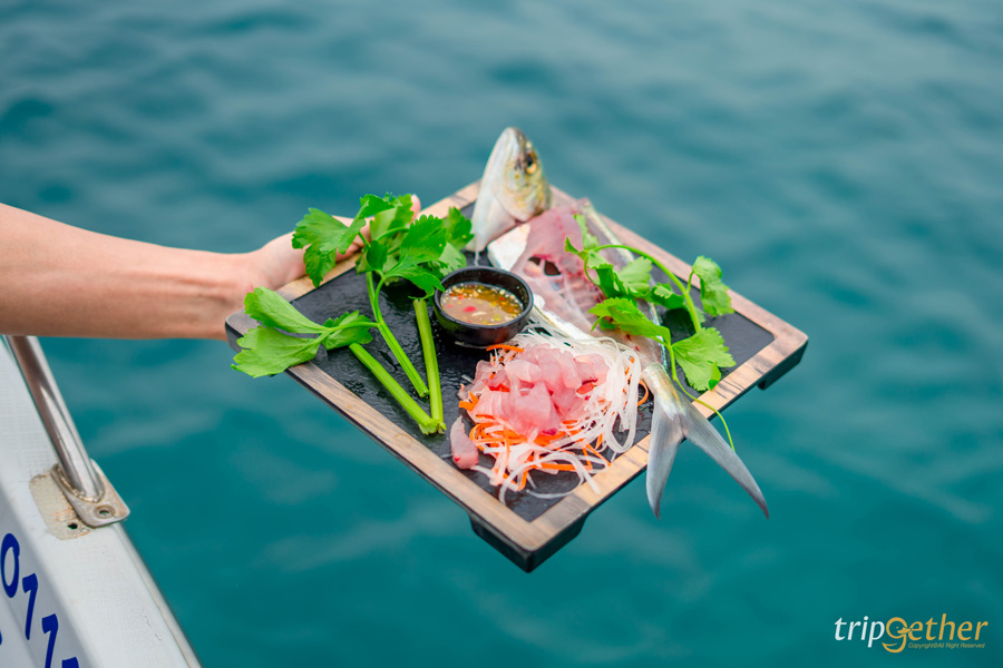 ระหว่างออกไปดำน้ำ ก็มีซาชิมิปลาทะเลที่ตกได้สดๆ มาให้ชิมบนเรือด้วย รสชาติหวานอร่อยสุดๆ
