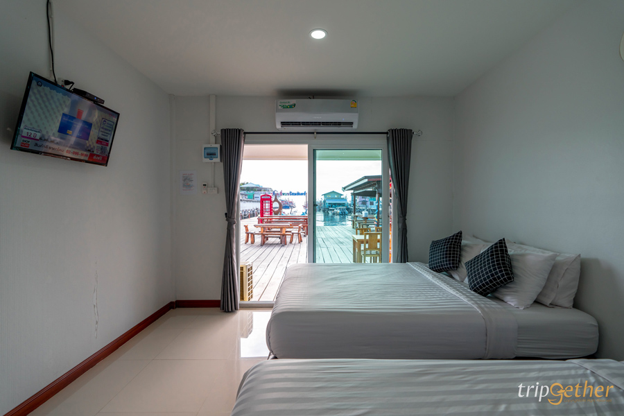 ห้องพักของที่นี่มีหลายแบบให้เลือก มีทั้งห้องวิวทะเลด้านหน้า ห้องวิวทะเลด้านข้าง แถมยังมีห้องที่สามารถพักได้ถึง 8 คน ในส่วนของห้องวิวทะเลด้านหน้า จะมีด้วยกันทั้งหมด 3 ห้อง ก็คือ ห้องปลาหมึก อยู่ริมซ้ายสุด, ห้องปูม้า อยู่ตรงกลาง และห้องฉลาม อยู่ริมขวาสุด อย่างห้องไฮไลท์ที่เราเอามาฝากกันวันนี้ คือ “ห้องฉลาม” พักได้ 2 – 4 คน มีกระจกใสบานใหญ่ ทำให้สามารถมองเห็นวิวภายนอกได้อย่างชัดเจน และที่พิเศษสุดๆ ก็คือวิวพระอาทิตย์ตกที่สามารถมองเห็นได้เลยจากห้องพัก เรียกได้ว่าบรรยากาศดีสุดๆ