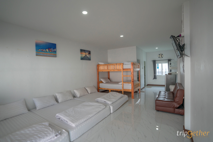 ส่วนอีกหนึ่งห้องที่เราเอามาฝากกันคือ “ห้องปลาวาฬ” เป็นห้องพักที่สามารถเข้าพักได้สูงสุดถึง 8 คน จึงเหมาะกับครอบครัวใหญ่หรือแก๊งเพื่อน สามารถพักได้ในห้องเดียวกัน ไม่ต้องแยกห้อง ภายในห้องมีที่นอนและเตียง 2 ชั้น และมีเฟอร์นิเจอร์กับเครื่องอำนวยความสะดวกครบถ้วนเช่นกัน นอกจากนี้ยังมีห้องน้ำให้ถึง 2 ห้องในห้องพักเลยด้วย