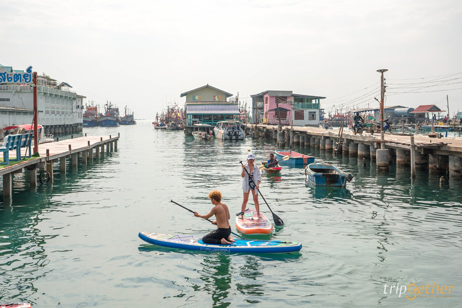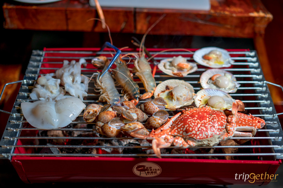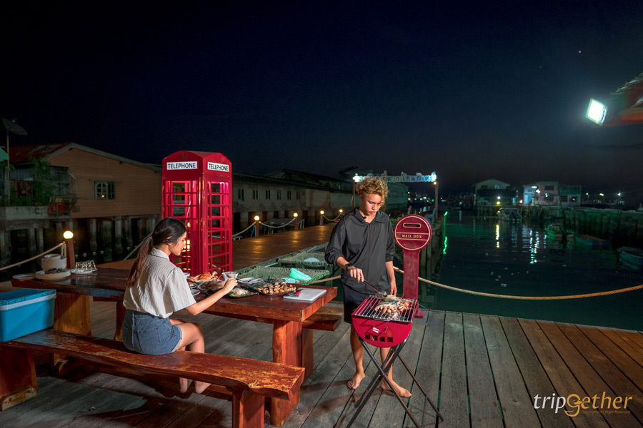 ตกหมึกกันเสร็จแล้วก็กลับมาที่พักกัน ที่นี่มีเตาปิ้งย่างและอุปกรณ์จานให้บริการ ให้นำหมึกและปลาที่ตกได้มาประกอบอาหารกันที่บริเวณที่พัก หรือสามารถซื้อจากข้างนอกมาปิ้งย่างกันในที่พักได้ โดยที่นี่มีตลาดใกล้ๆ อย่างตลาดอาหารทะเลช่องแสมสาร เราก็ไม่พลาดที่จะแวะไปซื้ออาหารทะเลสดๆ จากที่นี่