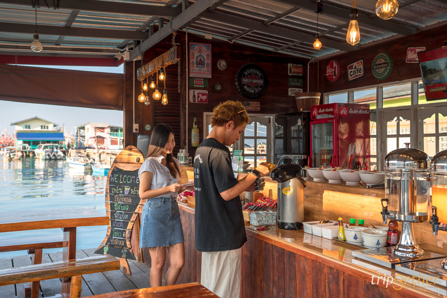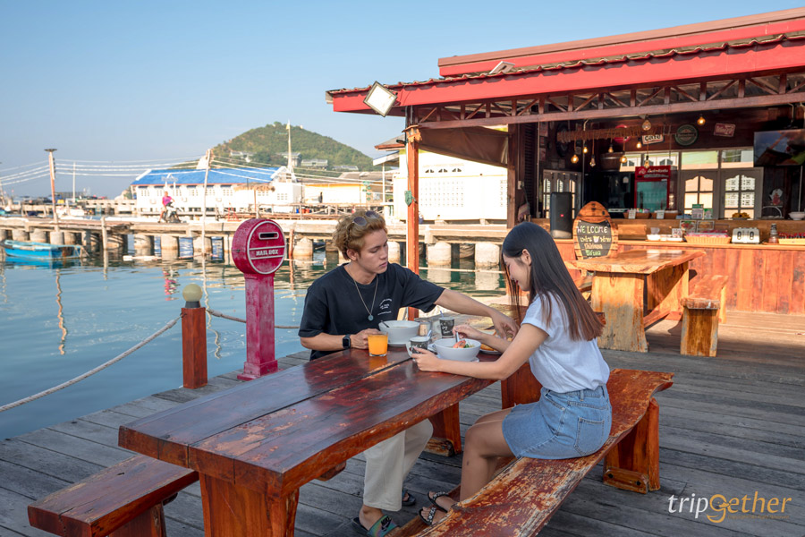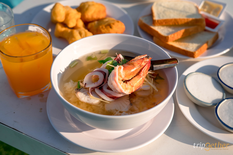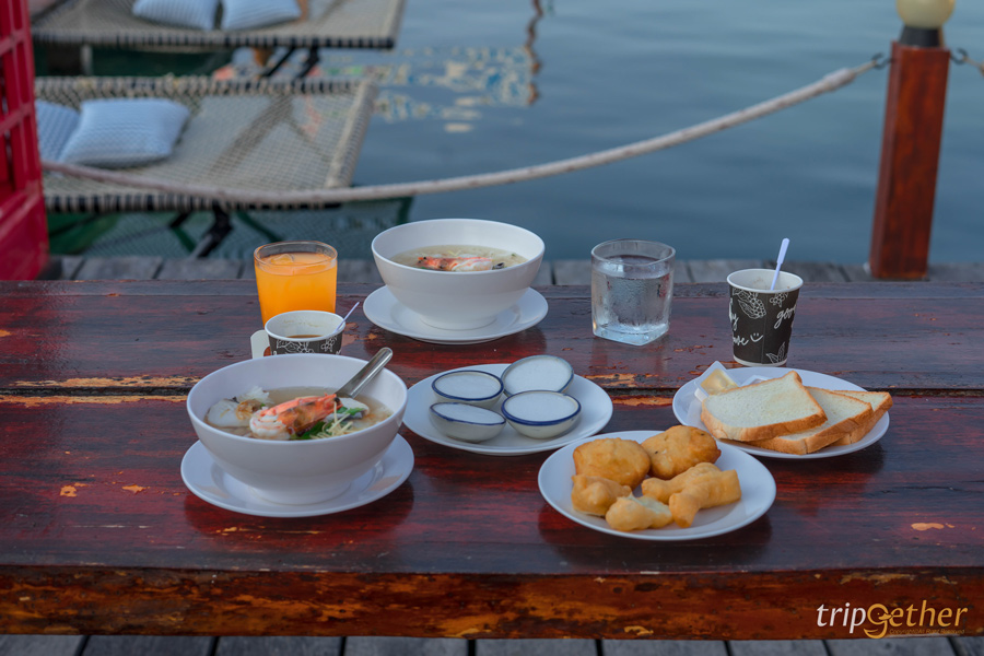 และปิดท้ายด้วยอาหารเช้า อาหารเช้าของที่นี่จะเป็นเซ็ตข้าวต้มทะเลแบบง่ายๆ แต่รสชาติดีสุดๆ ในข้าวต้มมีทั้งเนื้อปลา กุ้ง และหมึก สมกับเป็นที่พักติดทะเล ส่วนเครื่องดื่มก็มีทั้งน้ำเปล่า น้ำส้ม กาแฟ และโอวัลตินให้เลือกตามความชอบ นอกจากนี้ยังมีขนมปังปิ้ง กินพร้อมเนยและแยมสตรอว์เบอร์รี่ มีปาท่องโก๋ และยังมีของหวานอย่างขนมถ้วยให้ได้กินกันด้วย