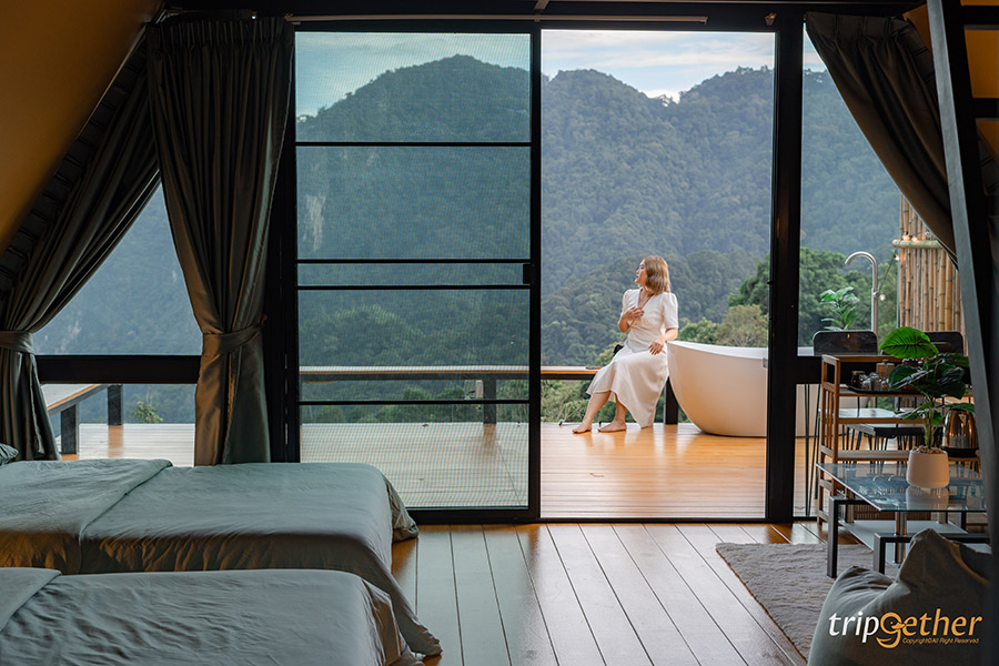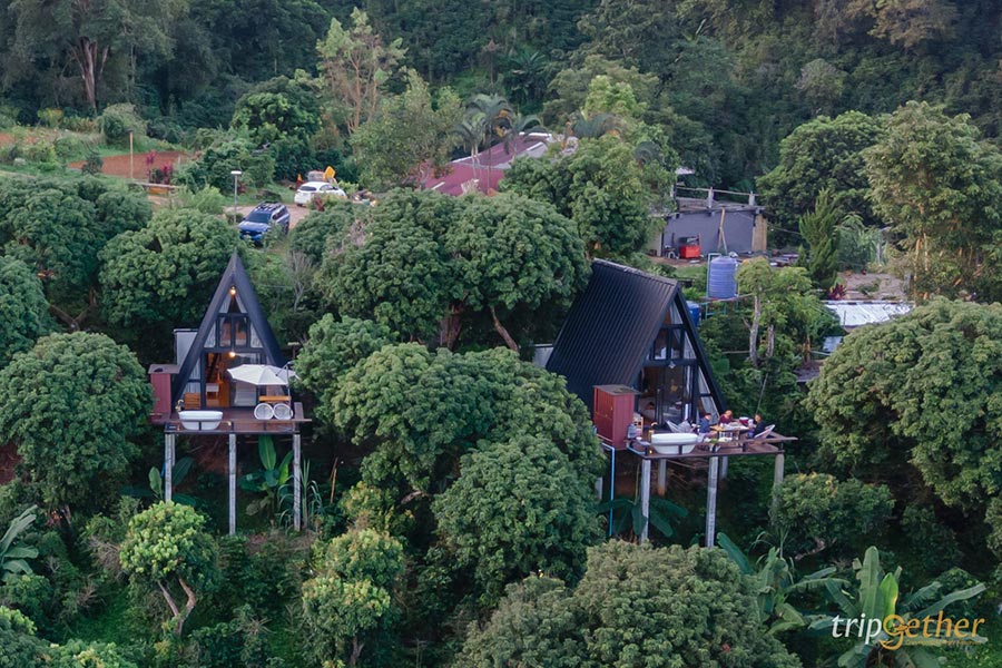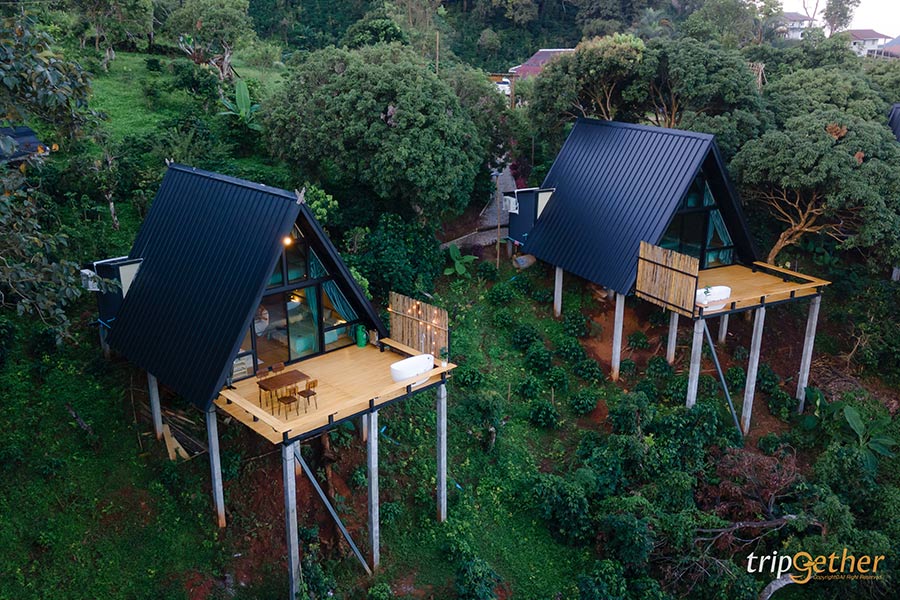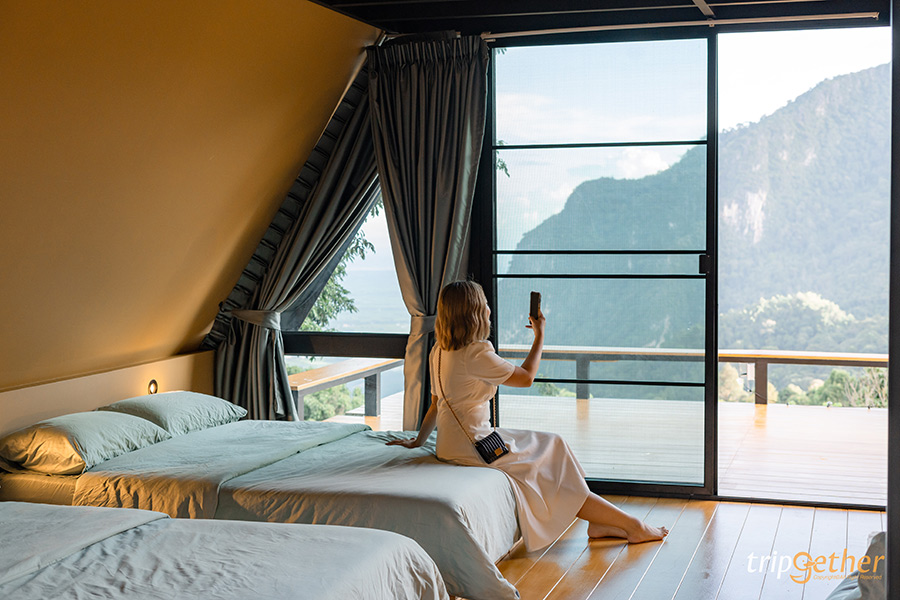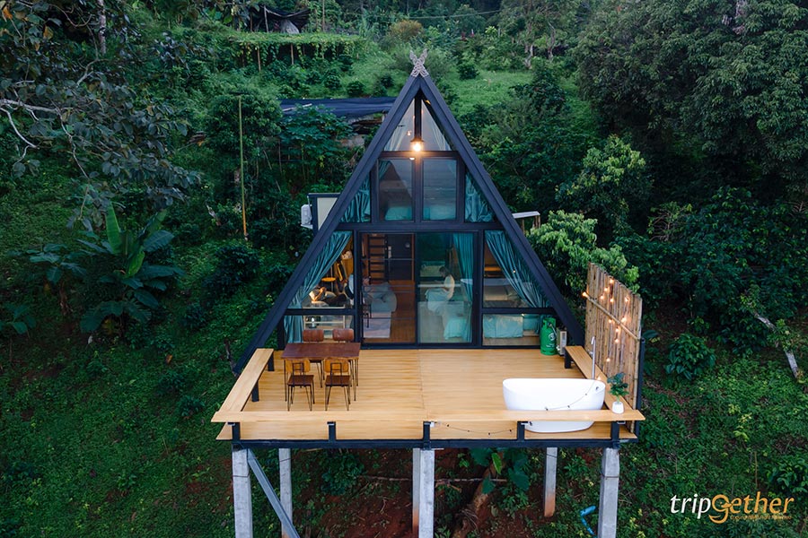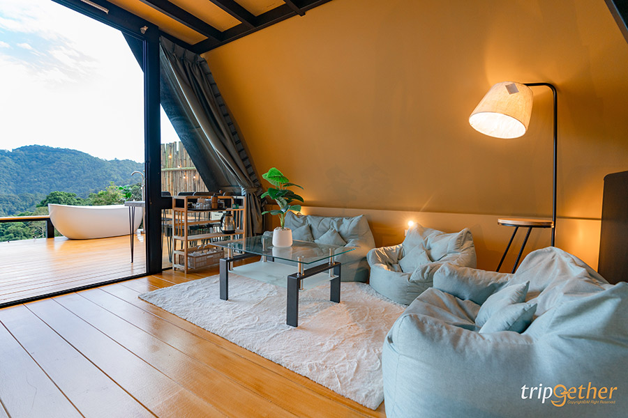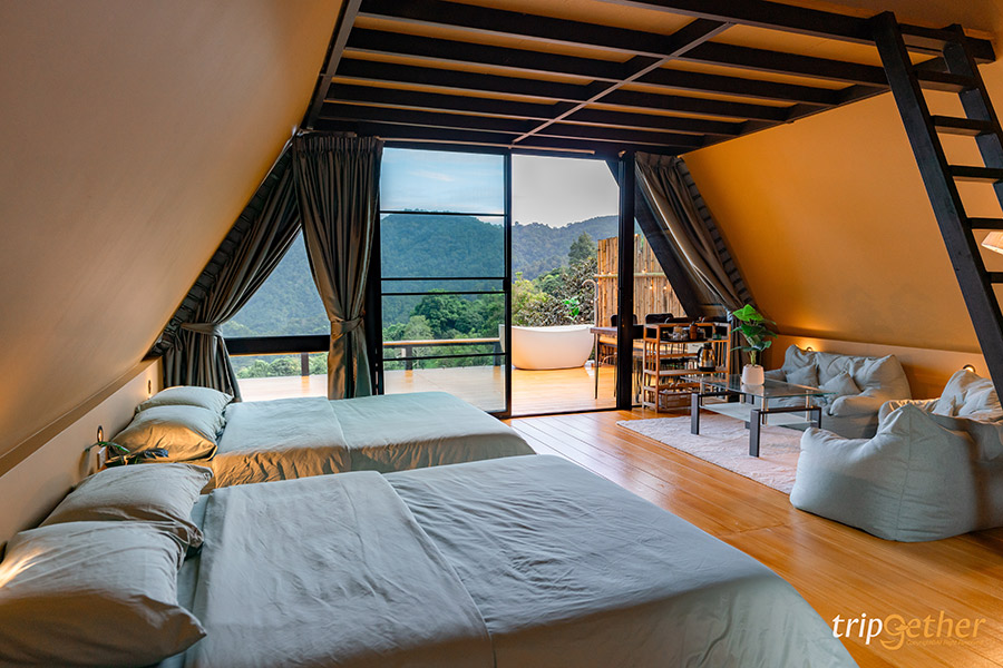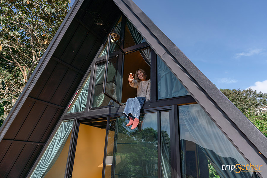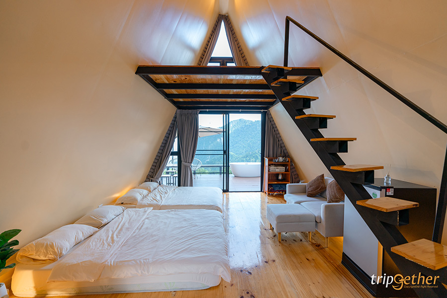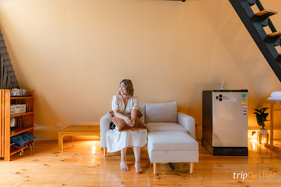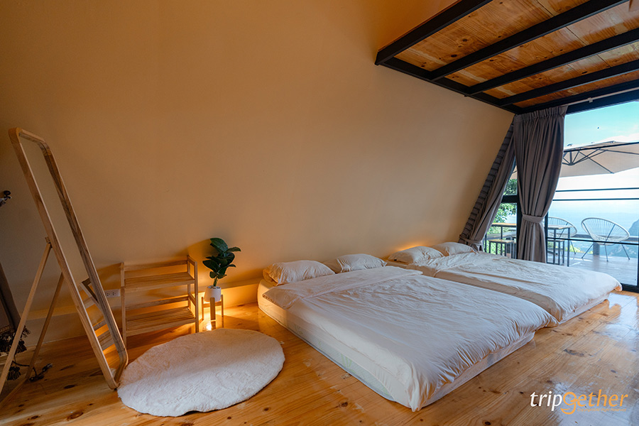 มาเริ่มที่หลังแรกเป็นบ้านขนาดใหญ่ อิงหมอก เข้าพักได้ 4 คนและเสริมได้อีก 2 คน (ที่นอนเสริมจ่ายเพิ่มคนละ 800 บาท) ตัวบ้านดีไซน์เป็นทรงเอเฟรมน่ารัก เมื่อเข้ามาข้างในจะพบกับพื้นที่กว้าง จัดสรรสัดส่วนได้อย่างเป็นระเบียบ แบ่งโซนที่นอนและห้องนั่งเล่นอย่างชัดเจน อีกทั้งยังมีชั้น 2 ที่ให้ฟีลเหมือนห้องใต้หลังคา โดยปกติตรงนี้จะเป็นพื้นที่สำหรับเตียงเสริม แต่ถ้าใครไม่ได้เสริมเตียงก็ทำเป็นมุมถ่ายรูปได้เหมือนกัน อีกหนึ่งไฮไลท์ก็คือระเบียงหน้าห้องกับวิวความกรีนแบบพาโนรามา ตกเย็นมานั่งรับลมสบายๆ ดูวิวเพลินๆ แค่นี้ก็เหมือนได้ชาร์จพลังจากความเหนื่อยล้า