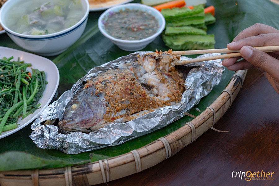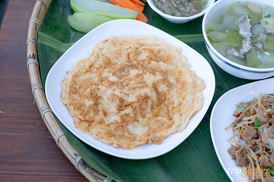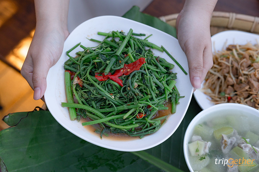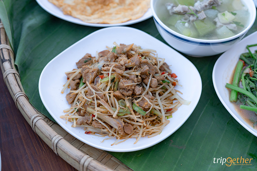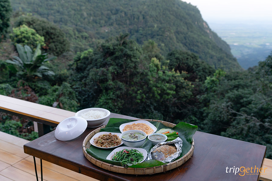 ในส่วนของอาหาร ที่นี่จะเสิร์ฟให้ 2 มื้อก็คือมื้อเช้าและมื้อเย็น ซึ่งรวมกับราคาห้องพักแล้ว สำหรับมื้อเย็นจะเป็นอาหารพื้นเมือง แต่ถ้าใครอยากกินหมูกระทะก็มีให้สั่งเพิ่มได้ ที่สำคัญเราสามารถสั่งมานั่งกินชิลล์ๆ ได้ที่ระเบียงหน้าห้อง มาพูดถึงชุดอาหารเย็นพื้นเมืองกันก่อน ในเซ็ตอาหารพื้นเมืองจะมีทั้งหมด 6 เมนู แต่ละจานหน้าตาน่ากิน แถมมีความหลากหลาย ทั้งหมูผัดรากชู ปลาสมุนไพร น้ำพริกถั่ว ผักต้ม แกงฟัก ผัดยอดฟักแม้ว และไข่เจียว