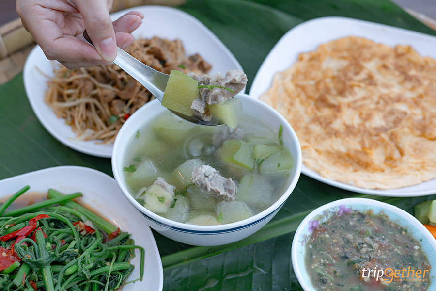 มาซดซุปร้อนๆ ด้วย แกงฟัก รสกลมกล่อม ตัวน้ำซุปซึมเข้าไปในเนื้อฟักอย่างดี กัดไปแล้วกรอบฉ่ำมาก แถมมีซี่โครงหมูชิ้นใหญ่อีกด้วย