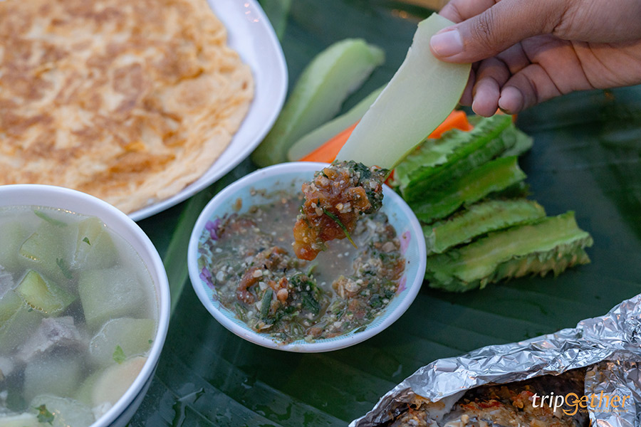 น้ำพริกถั่ว ผักต้ม เสิร์ฟมาคู่กับผักต้ม ตัวน้ำพริกมีรสจัดจ้าน แต่เมื่อมาจิ้มคู่กับผักหวาน ช่วยเสริมรสชาติกันและกัน