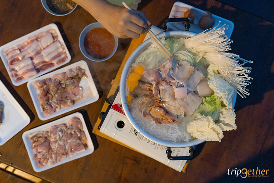 แต่ถ้าใครอยากกินปิ้งย่าง หมูกระทะ ก็พร้อมเสิร์ฟ แต่อันนี้ไม่รวมอยู่ในราคาที่พัก ต้องจ่ายแยก โดยหมูกระทะจะมีให้เลือกหลายราคาตั้งแต่ 399, 499 และ 599 บาท ในเซ็ตมีทั้งหมูหมัก หมูสามชั้น กุ้ง ชุดผัก บวกกับมีน้ำจิ้มสุดแซ่บ จิ้มจุมกันเพลินๆ ไปเลย เซ็ตหมูกระทะและบรรยากาศบนดอยคือที่สุดของมื้อเย็น