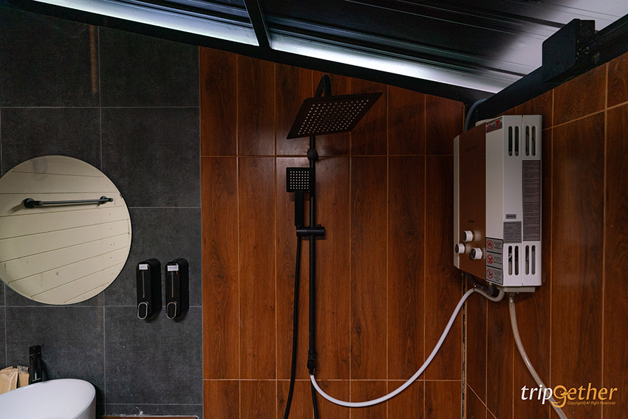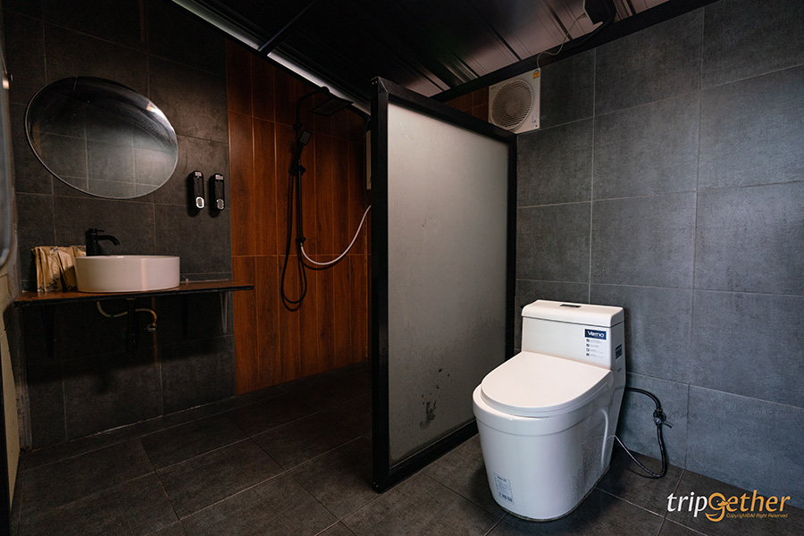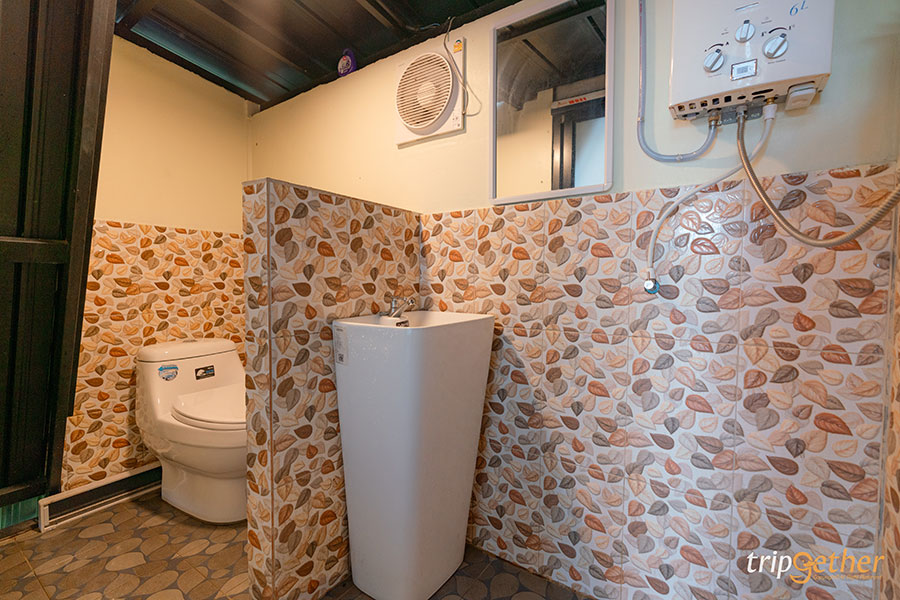 ส่วนห้องน้ำจะเป็นห้องน้ำส่วนตัว ภายในมีแบ่งโซนแห้งและโซนเปียก พร้อมสิ่งอำนวยความสะดวกครบ ทั้งเครื่องทำน้ำอุ่น สบู่ แชมพู ฝักบัวแบบเรนชาวเวอร์