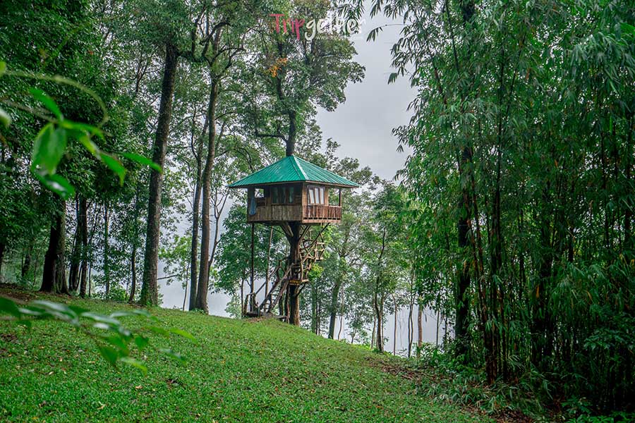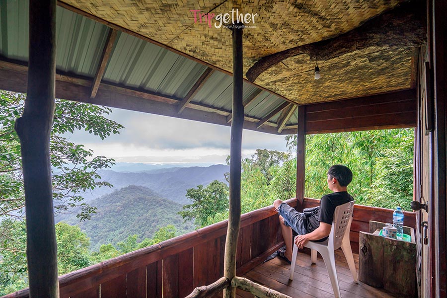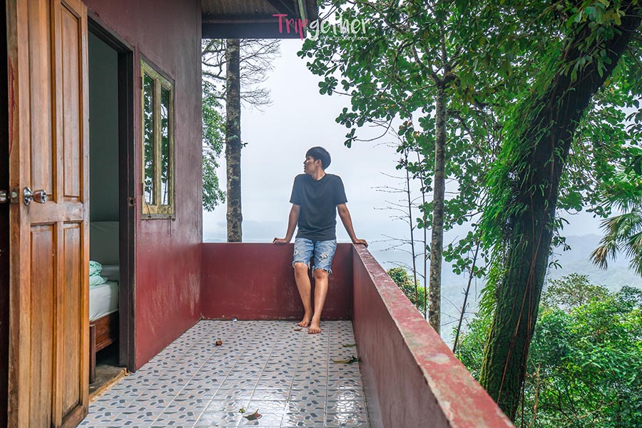 เมื่อขึ้นมาด้านบนบ้านทาร์ซาน ด้านหน้าก็จะมีระเบียงไว้ให้นั่งชมวิวแบบชิลล์ๆ เรียกได้ว่านั่งมุมนี้จะต้องฟินแน่นอนเพราะนอกจากจะได้เห็นวิวภูเขาแล้ว ยังได้เห็นวิวเขื่อนวชิราลงกรณ์อีกด้วย