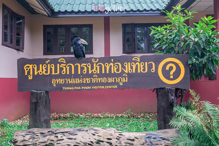 ป้ายด้านหน้าศูนย์บริการนักท่องเที่ยวจะมีนกเงือกตัวใหญ่คอยต้อนรับด้วยเช่นกัน