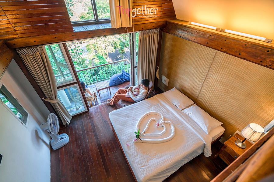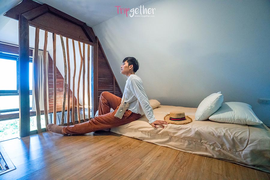 ส่วนบริเวณชั้น 2 จะเป็นชั้นลอยที่มีพื้นที่ค่อนข้างจำกัด สามารถเสริมเตียงนอนเพิ่มได้ หรือจะมานั่งชิลล์ๆ ชมวิวจากมุมนี้ ก็มองเห็นทะเลได้เช่นกัน
