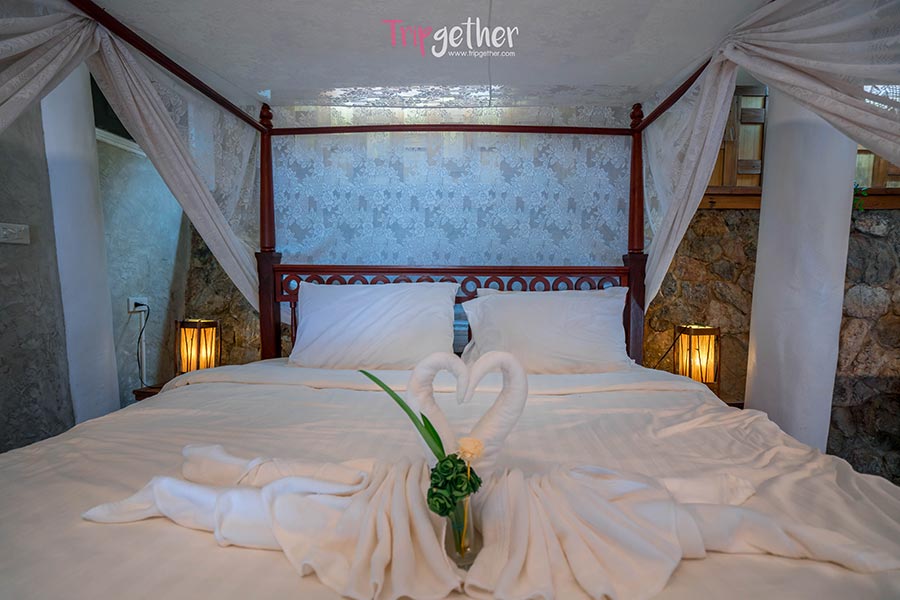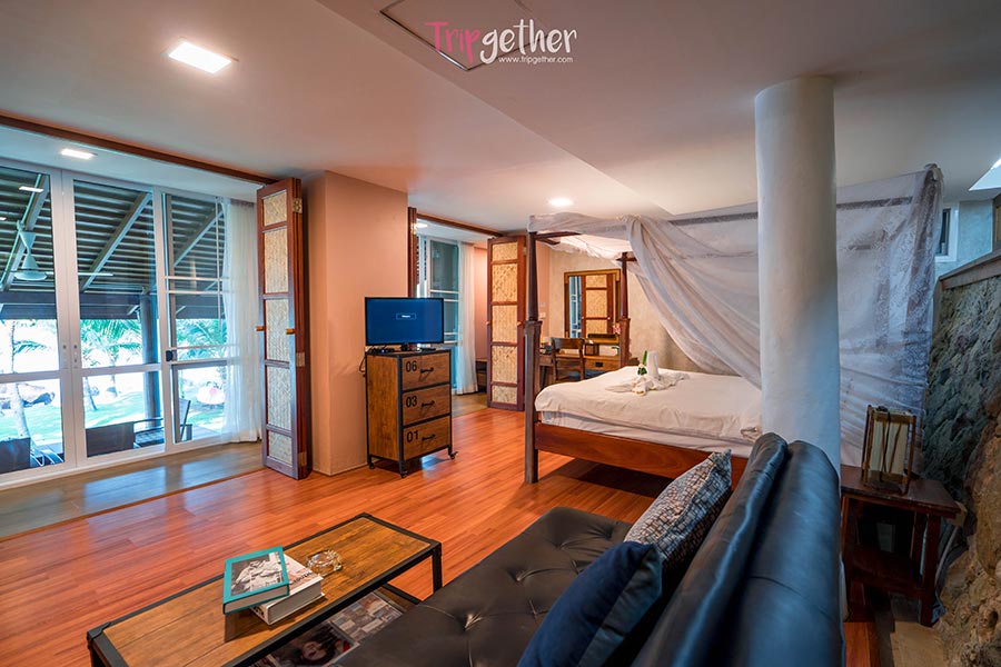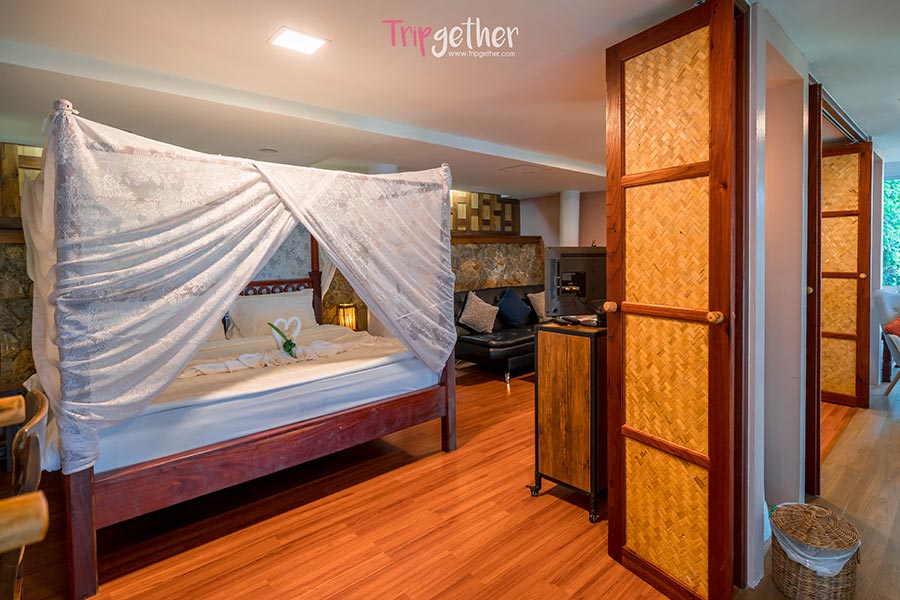 บรรยากาศภายในห้องพักจะตกแต่งด้วยมุ้งสีขาวและเตียงไม้ในสไตล์บูติก มีสิ่งอำนวยความสะดวกที่ครบครันทั้งโทรทัศน์ เครื่องปรับอากาศ พร้อมมุมโซฟาให้นั่งพักผ่อนภายในห้อง