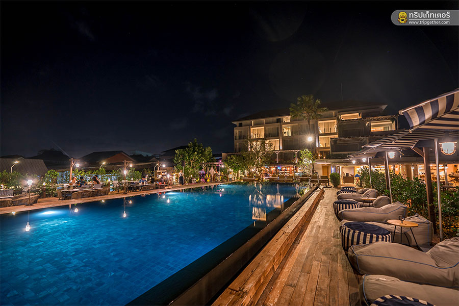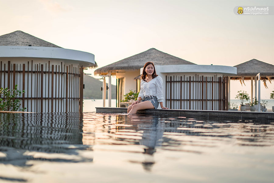 บริเวณพื้นที่ส่วนกลางของรีสอร์ท มีสระว่ายน้ำแบบอินฟินิตี้พูลให้เราว่ายน้ำชมวิวทะเลได้แบบ 180 องศา