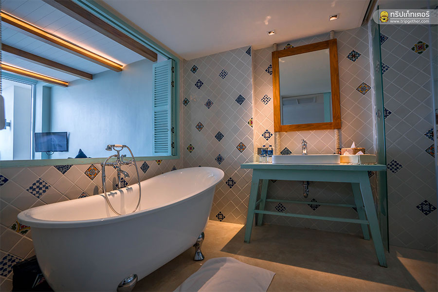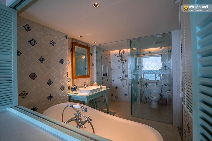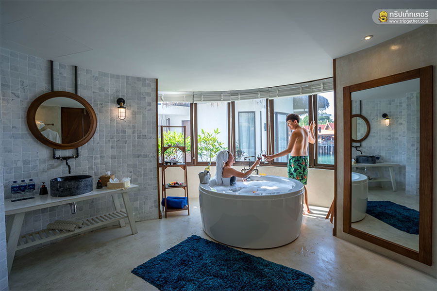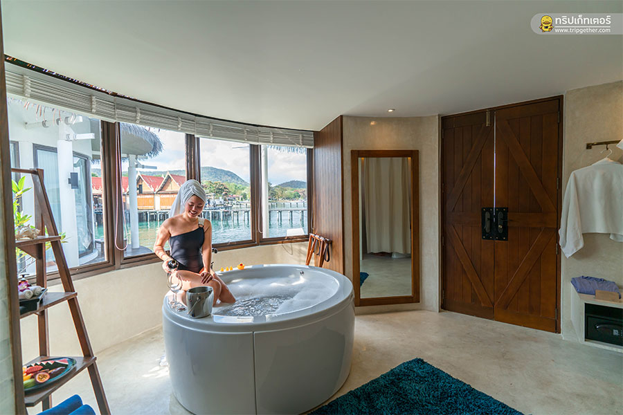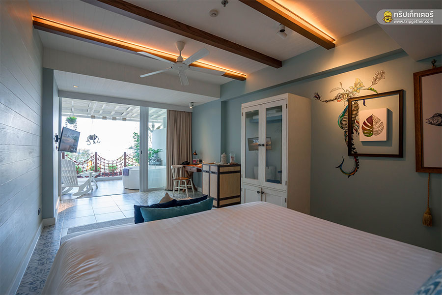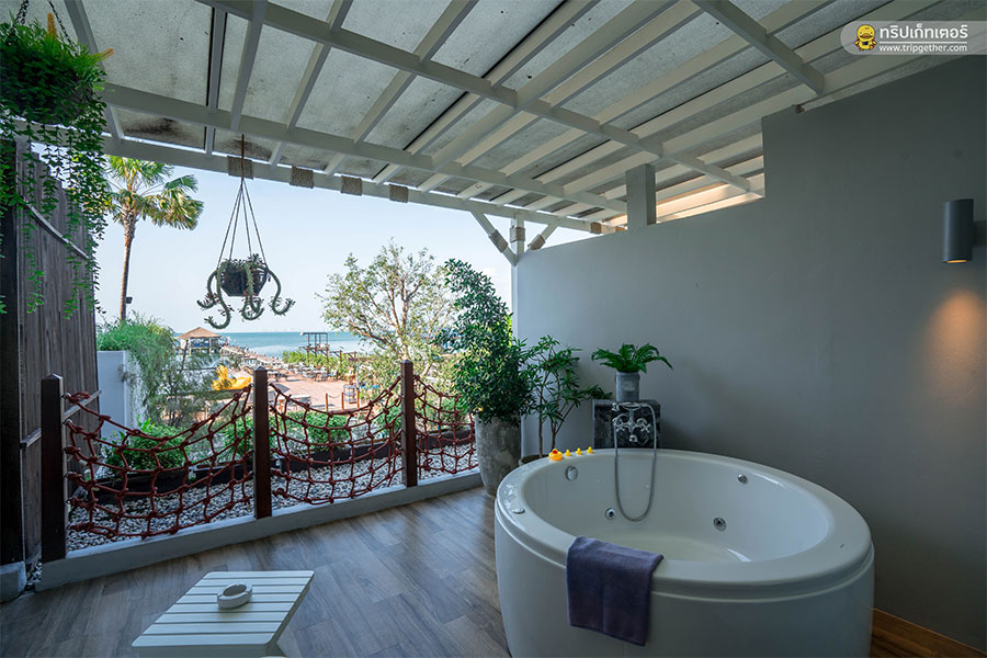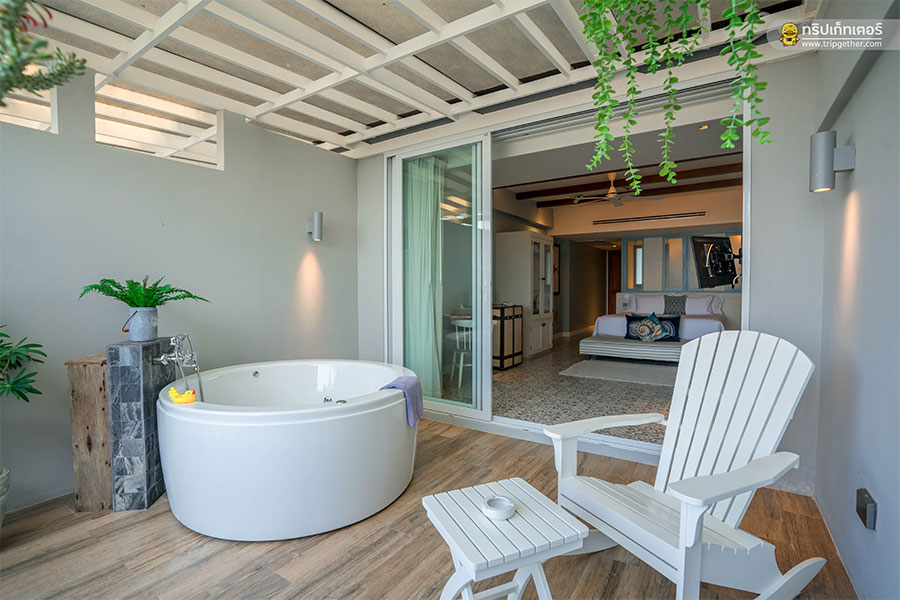 สำหรับห้องนี้มีอ่างจากุชชี่ริมระเบียงให้คุณได้นอนแช่น้ำผ่อนคลาย พร้อมชมวิวทะเลได้แบบชิลล์ๆ กันอีกด้วย