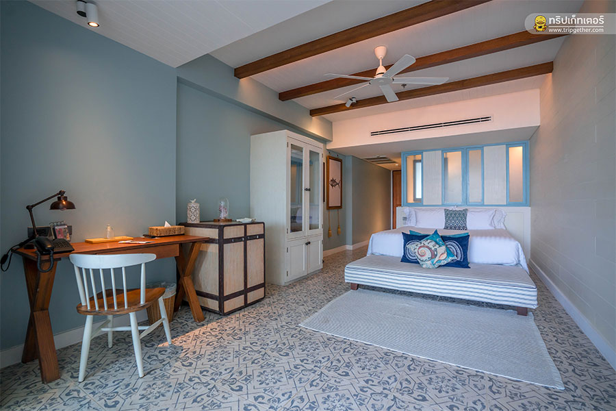 ปิดท้ายกันที่ห้อง Kept Deluxe ห้องพักขนาดกำลังดี บนพื้นที่ 44 ตรม. ที่เน้นการตกแต่งที่ดูสบายตาในสไตล์และคุมโทนด้วยสีฟ้าและขาวได้เป็นอย่างดี ภายในห้องพักครบครันด้วยสิ่งอำนวยความสะดวกอย่างดี มีมุมโต๊ะหนังสือให้นั่งเล่น หรือจะมาเปลี่ยนสถานที่ทำงานก็ชิลล์ไปอีกแบบ