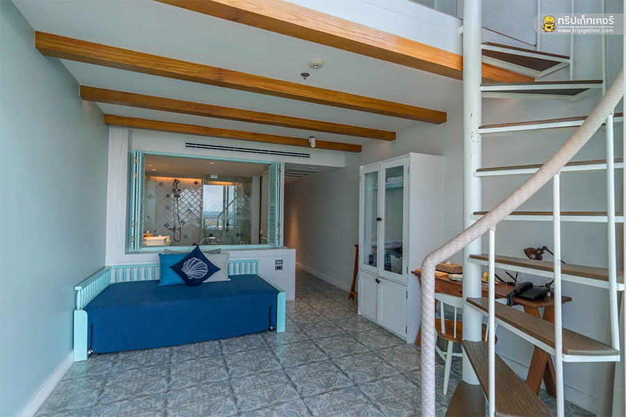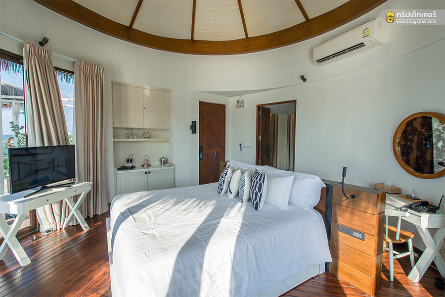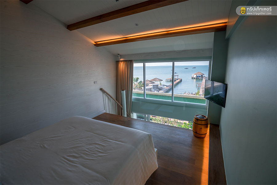 ส่วนบริเวณชั้นบนจะเป็นห้องนอน ที่สามารถนอนกลิ้งบนเตียงนุ่มๆ แล้วดูวิวทะเลได้จากบนเตียงกันเลย นอกจากนี้ยังครบครันด้วยสิ่งอำนวยความสะดวกอย่างมากมาย ที่รับรองว่าคุณจะไม่อยากออกไปไหนอย่างแน่นอน