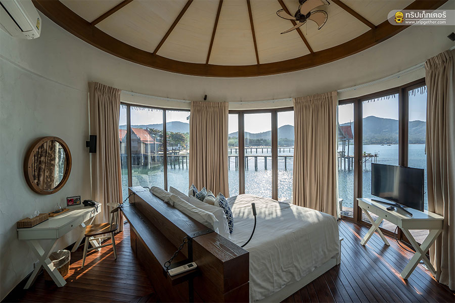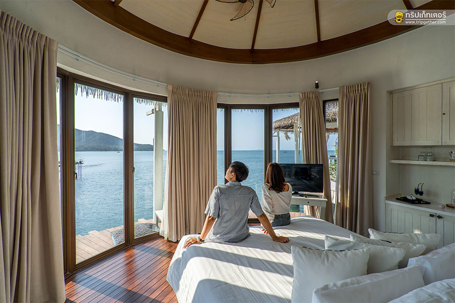 บรรยากาศภายในห้องพักเน้นการใช้งานไม้และกระจกให้สามารถมองเห็นวิวทะเลได้จากบนเตียง