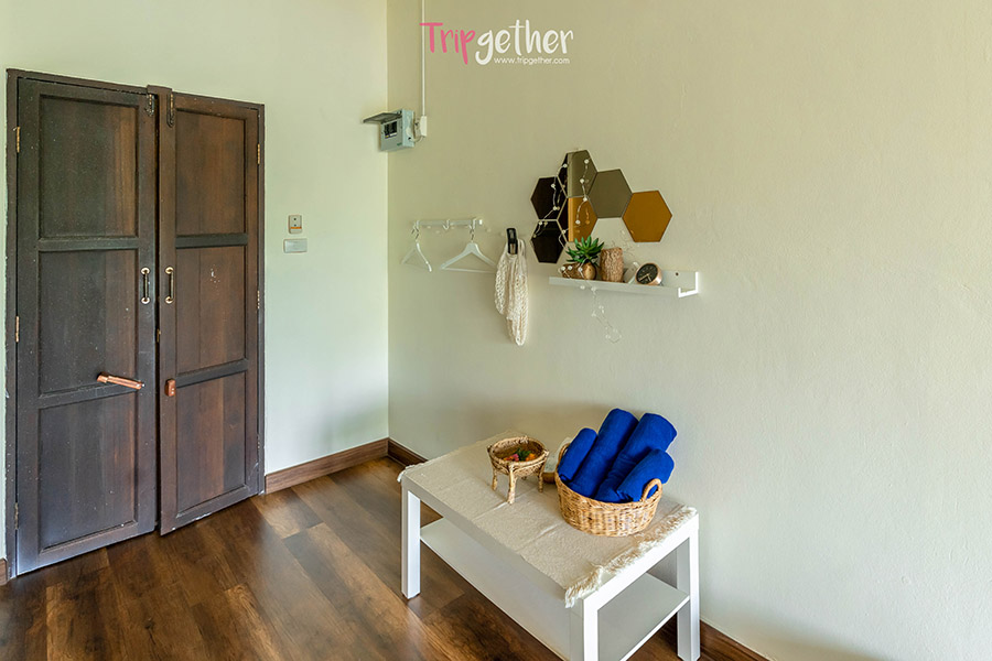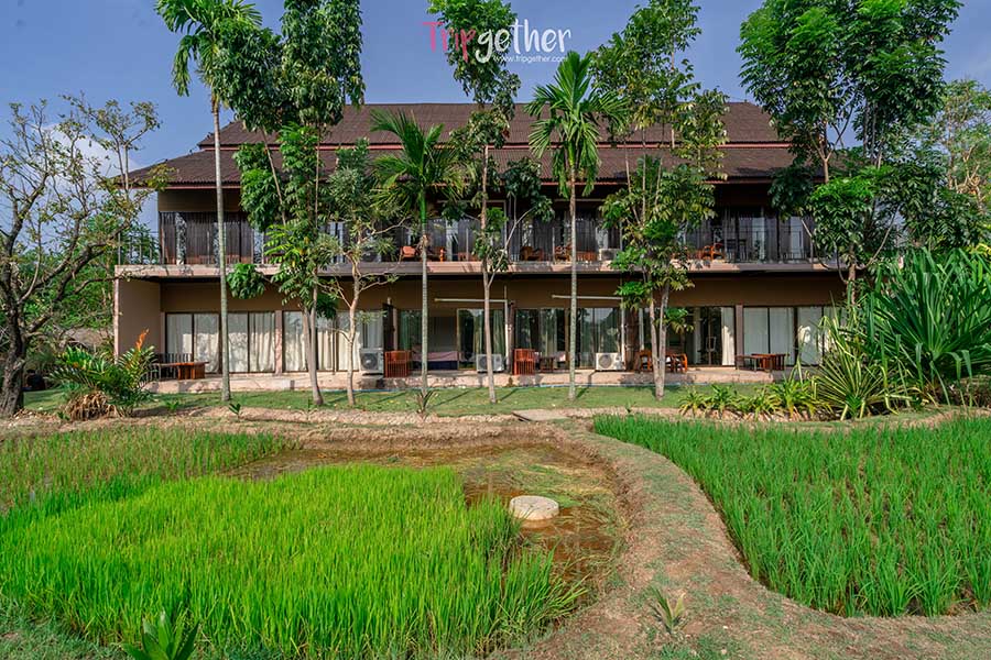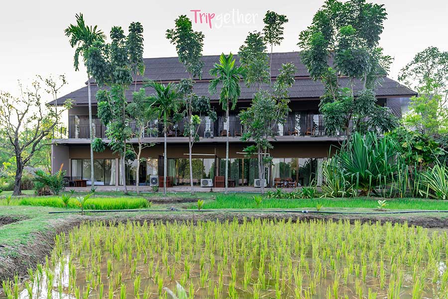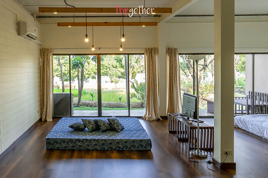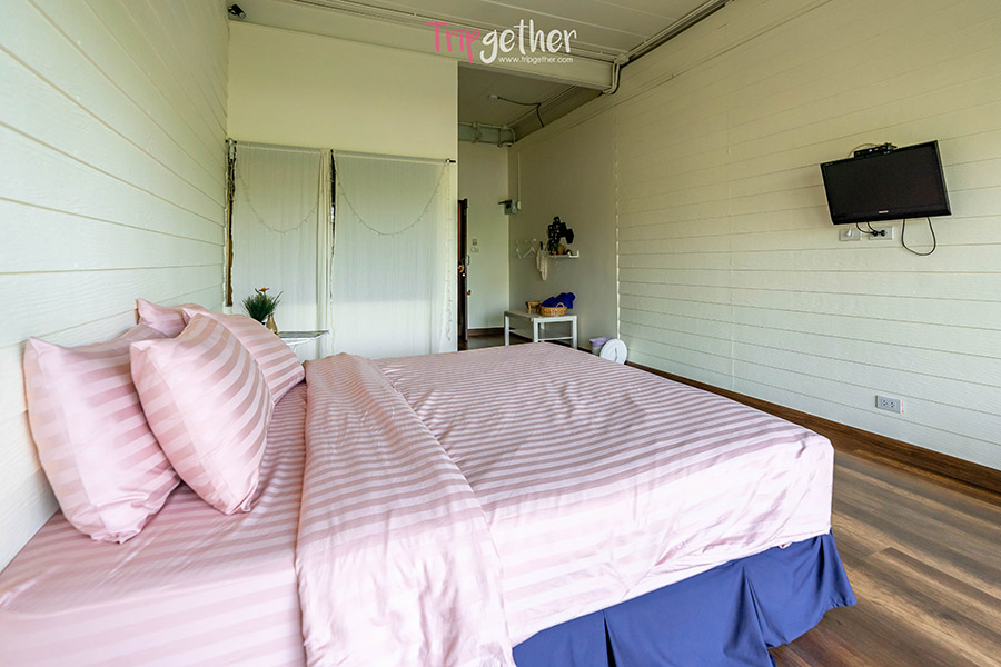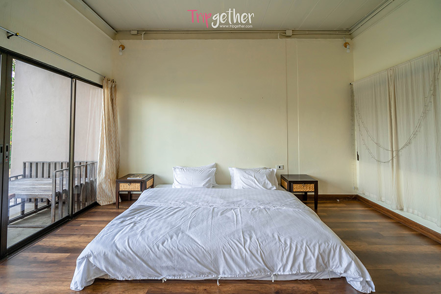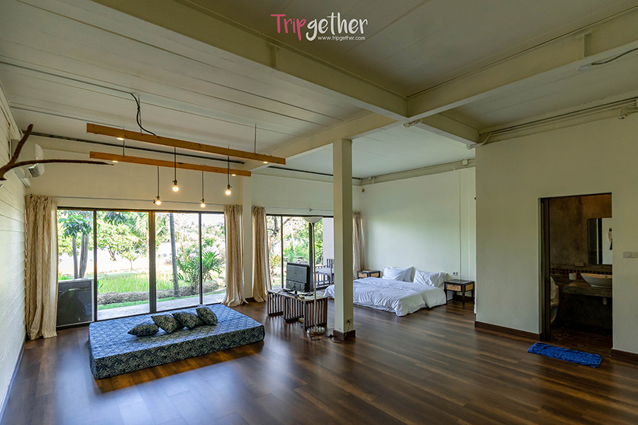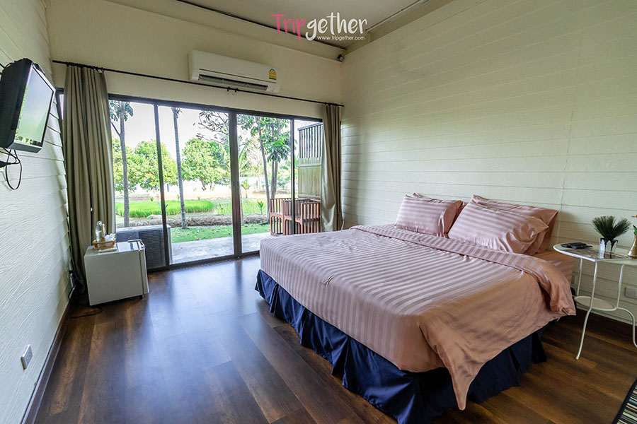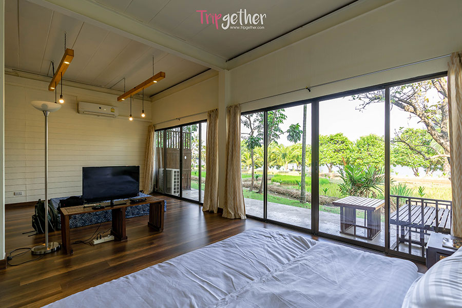 และยังสามารถมองวิวทุ่งนาและแม่น้ำบางปะกงผ่านประตูกระจกบานใหญ่ด้านหน้าห้องได้อย่างสบายตา หรือจะเปิดประตูกระจกออกไปรับลมชมวิวทุ่งนาก็ฟินไปอีกแบบ