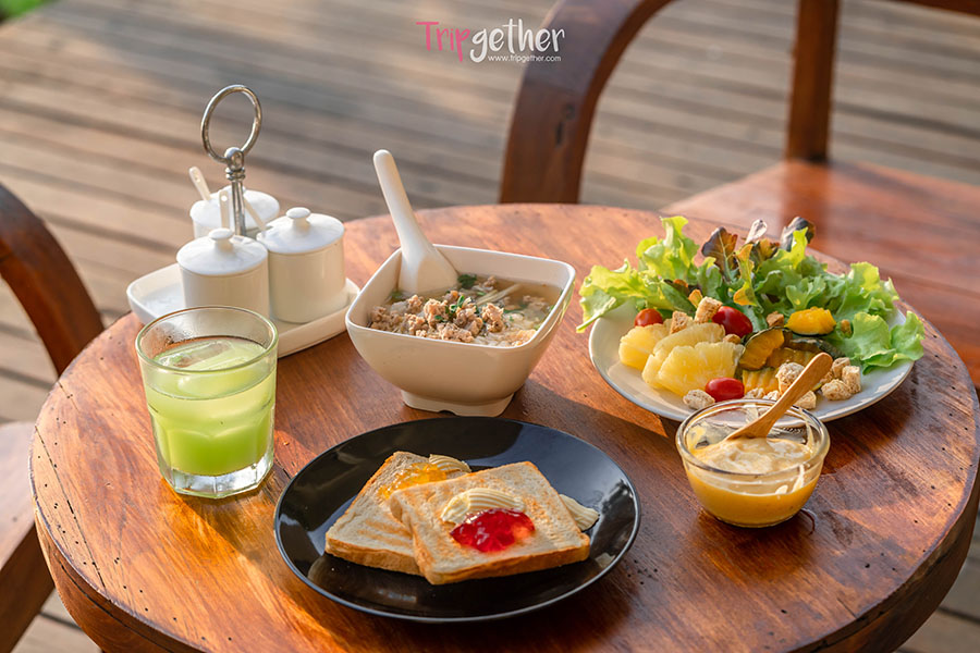 สำหรับอาหารเช้าของ เดวา ฉะเชิงเทรา ก็มีทั้งสลัดผักสดๆ จากสวนและข้าวต้มหมูเนื้อเน้นๆ ให้เติมพลังกันในตอนเช้า