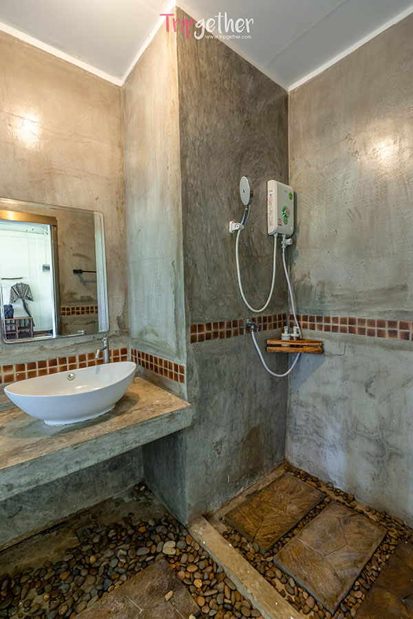 สำหรับห้องน้ำภายในห้องก็ยังคงตกแต่งด้วยวัสดุจากธรรมชาติและเพิ่มลูกเล่นโดยการใช้ก้อนหินจริงๆ มาทำเป็นพื้นห้องน้ำและโดดเด่นด้วยผนังแบบปูนเปลือยเพื่อให้ผู้เข้าพักได้อารมณ์เหมือนได้อิงแอบและใกล้ชิดกับธรรมชาติตลอดเวลาที่เข้าพัก