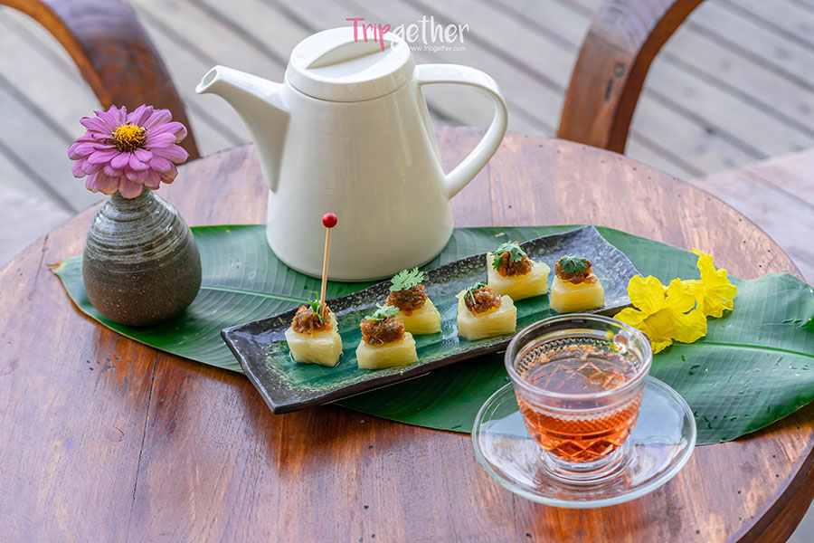 และยังได้ผ่อนคลายไปกับ Tea Time การจิบชาร้อนสไตล์อังกฤษกับรสชาติชาแบบไทยๆ อย่างชากุหลาบหอมๆ ที่เสิร์ฟพร้อมเมนูของว่างท้องถิ่นแบบไทยๆ อย่าง ม้าฮ้อ พร้อมนั่งชมวิวแม่น้ำบางปะกงที่ไหลไปอย่างช้าๆ