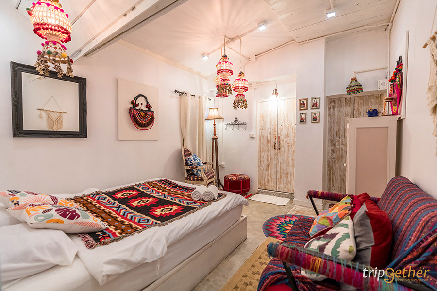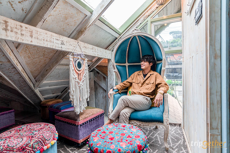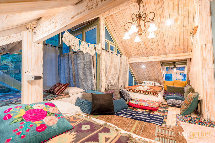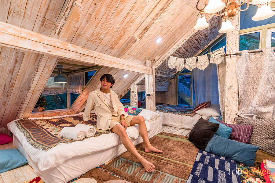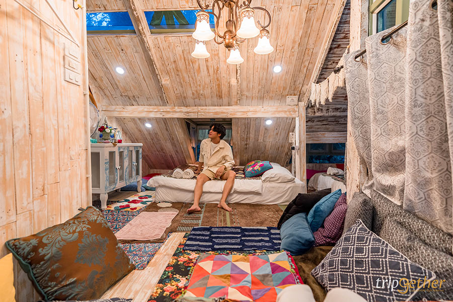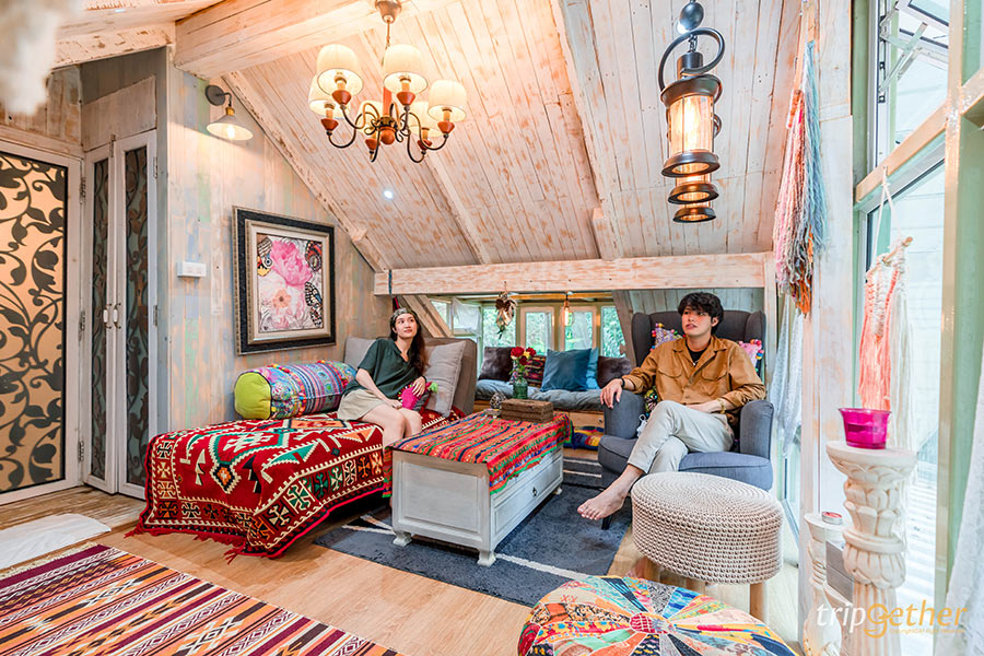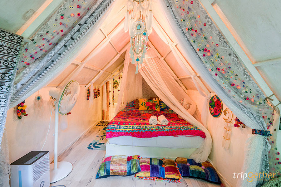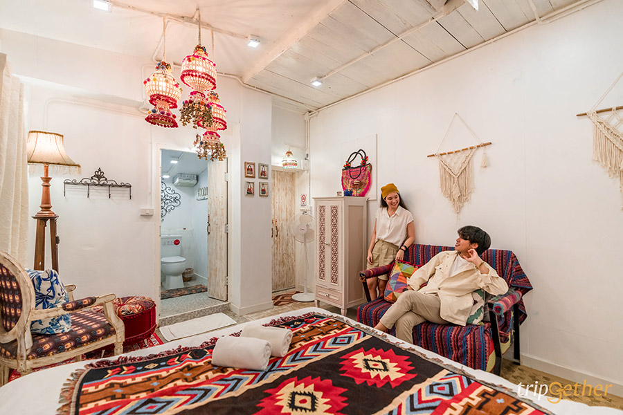 ทั้งห้องยังคงคอนเซ็ปต์ด้วยพรมและผ้าปูโบฮีเมียน พร้อมตกแต่งด้วยหมอนจำนวนมาก ให้ฟีลเหมือนไปนอนเล่นที่บ้านเพื่อน
