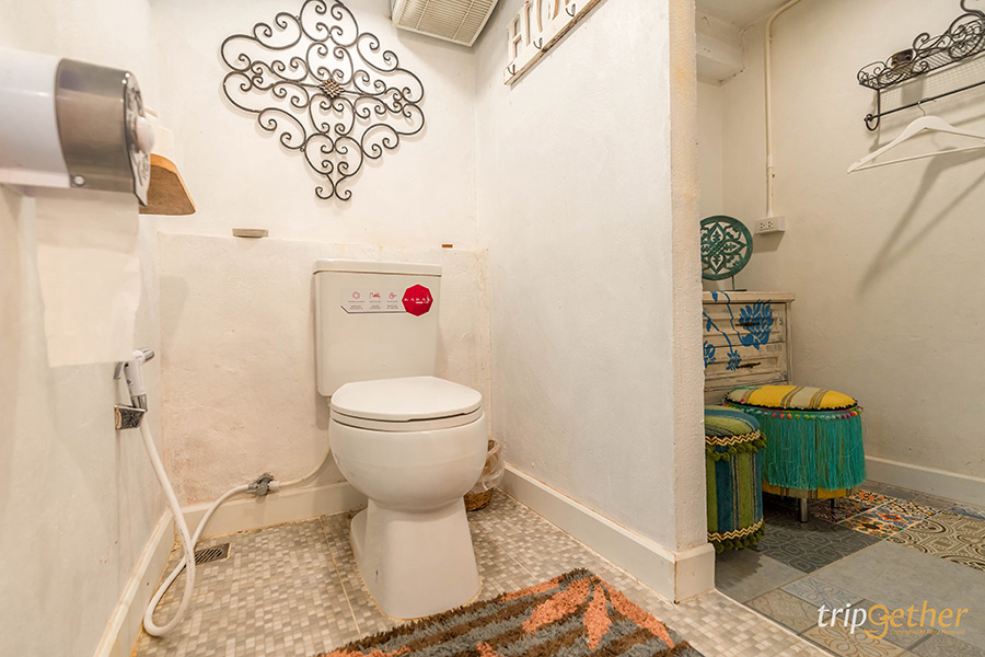 ห้องนี้มีห้องน้ำส่วนตัวในห้อง แต่ถ้ามากันหลายคน แล้วกลัวว่าห้องน้ำไม่พอ ทางที่พักก็มีห้องน้ำรวมที่นอกห้องเตรียมไว้ให้