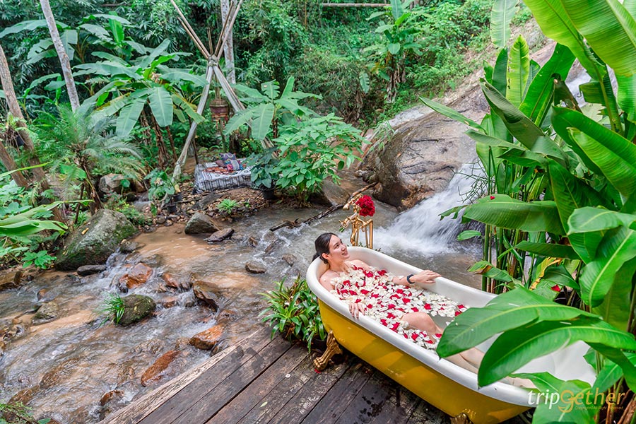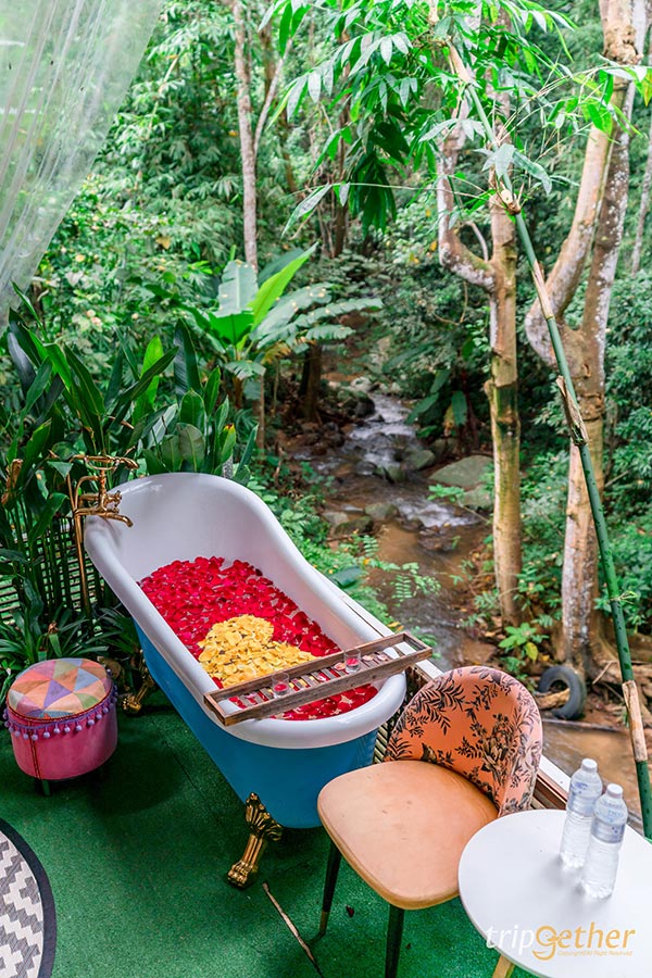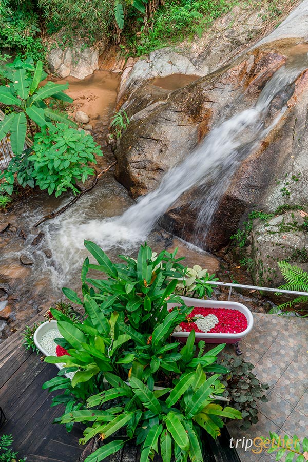 จุดไฮไลท์ที่ห้ามพลาด ต้องไปถ่ายรูปให้ได้ ก็คือโซนอ่างอาบน้ำกลางแจ้ง ที่โรยด้วยกลีบกุหลาบสีแดงสด ฉากหลังวิวน้ำตกและต้นไม้น้อยใหญ่ ให้บรรยากาศชุ่มฉ่ำ เย็นสบายมากๆ โดยอ่างอาบน้ำนี้จัดอยู่ในพื้นที่ส่วนกลาง มีทั้งหมด 2 อ่าง พิเศษมากๆ สำหรับคนที่มาพักที่นี่ รู้แล้วก็เตรียมชุดให้พร้อม โพสต์ท่าเริ่ดๆ แล้วรอรูปสวยๆ ได้เลย