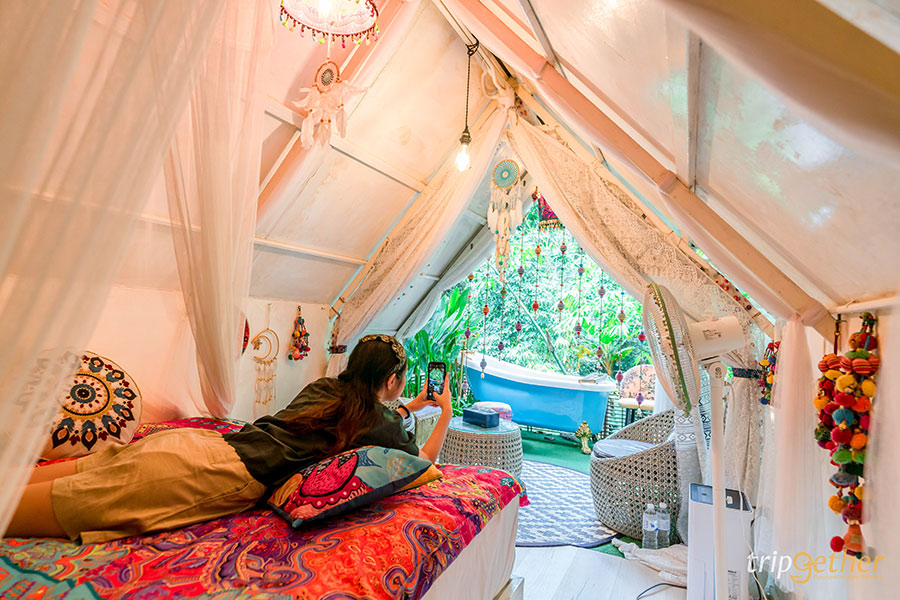 ถ้าเบื่อห้องพักแบบเดิมๆ ที่พักกระโจมก็เป็นอีกทางเลือกหนึ่งที่อยากแนะนำ การตกแต่งและบรรยากาศของที่เดอะการ์เร็ต ให้อารมณ์เหมือนพักผ่อนในกระโจมชนเผ่า ในยามเช้าตื่นมารับกลิ่นอายธรรมชาติ ฟังเสียงนกร้อง มองดูสายน้ำไหล เป็นอะไรที่ช่วยดีท็อกซ์จิตใจจากความเหนื่อยล้าได้ดีมาก ใครที่อยากลองเปลี่ยนบรรยากาศ มาแคมปิ้งในแบบชิลล์ๆ ต้องห้ามพลาดที่นี่เลย